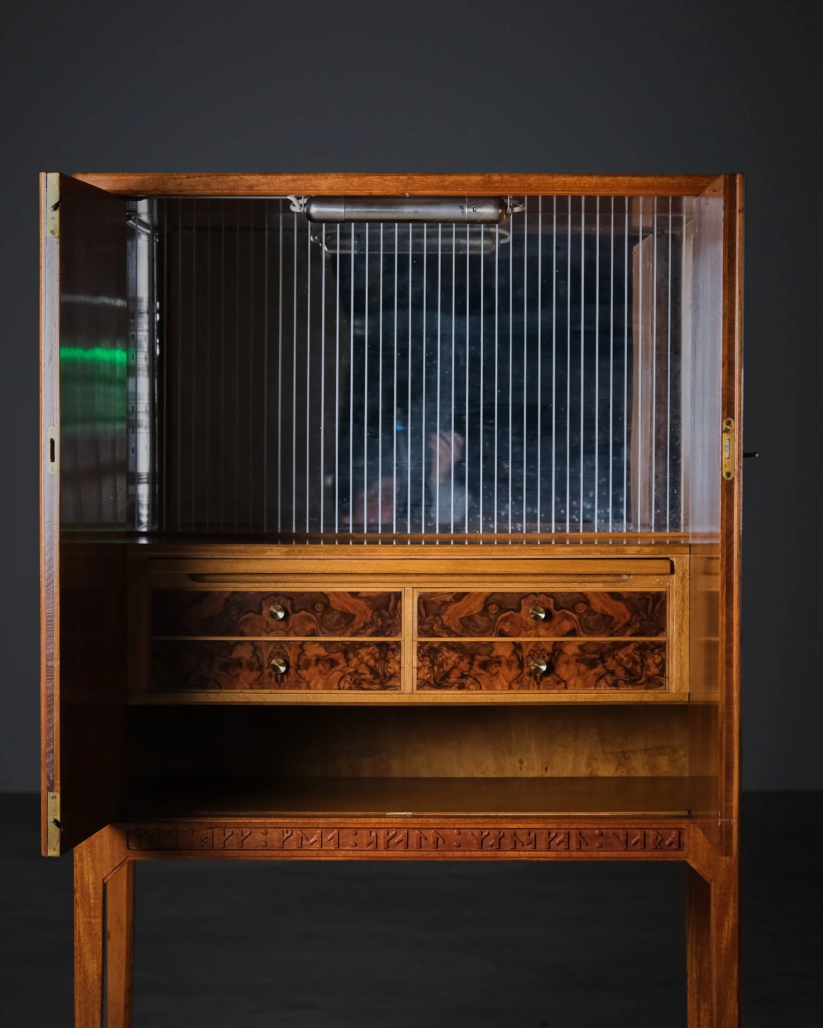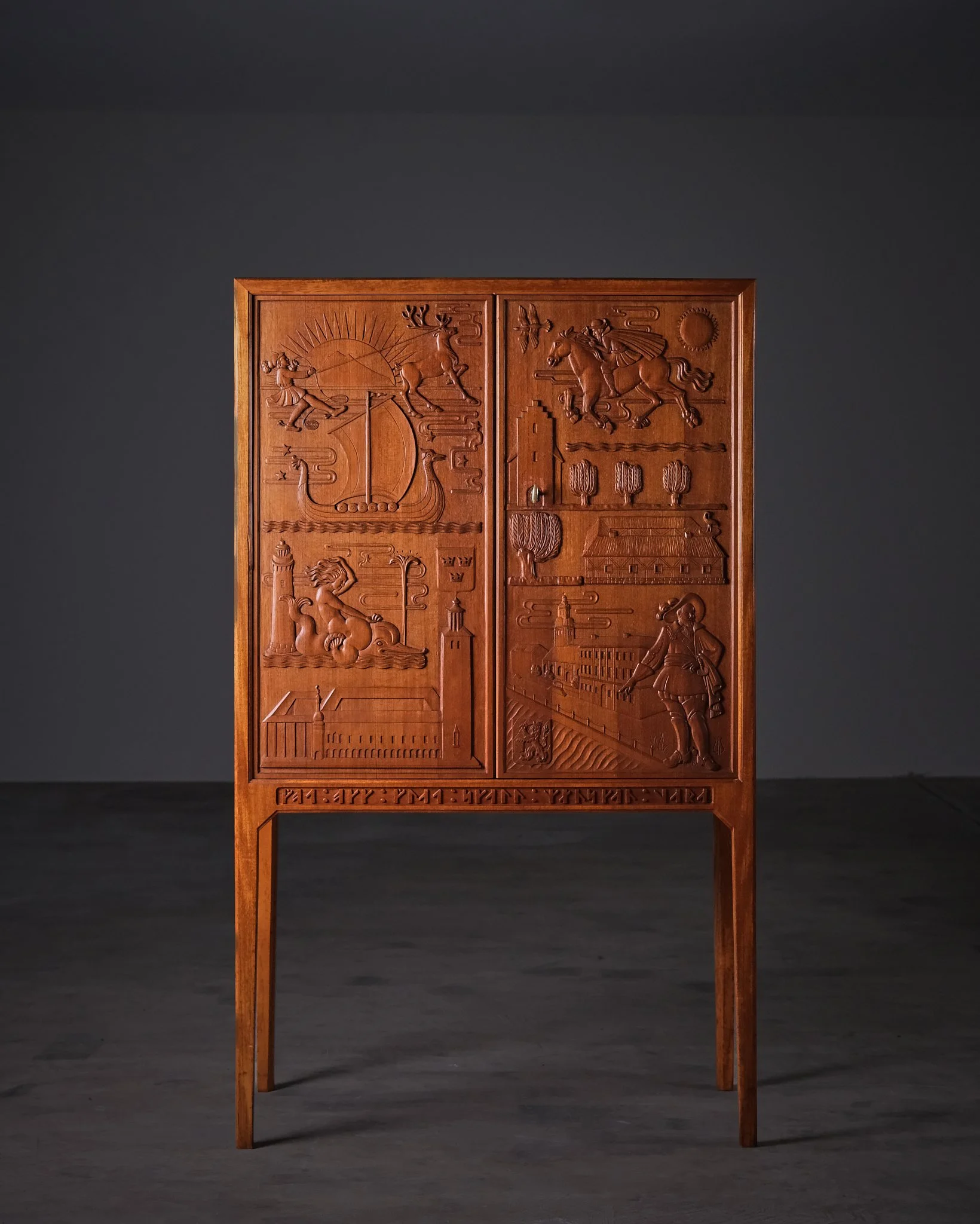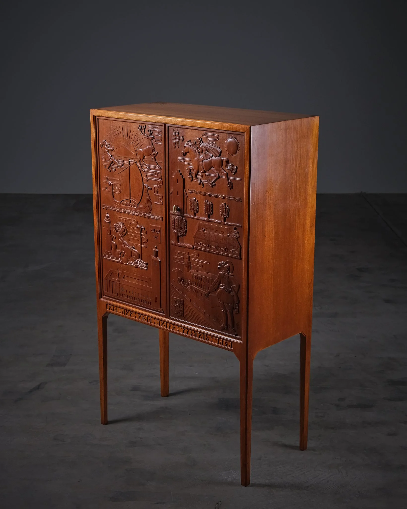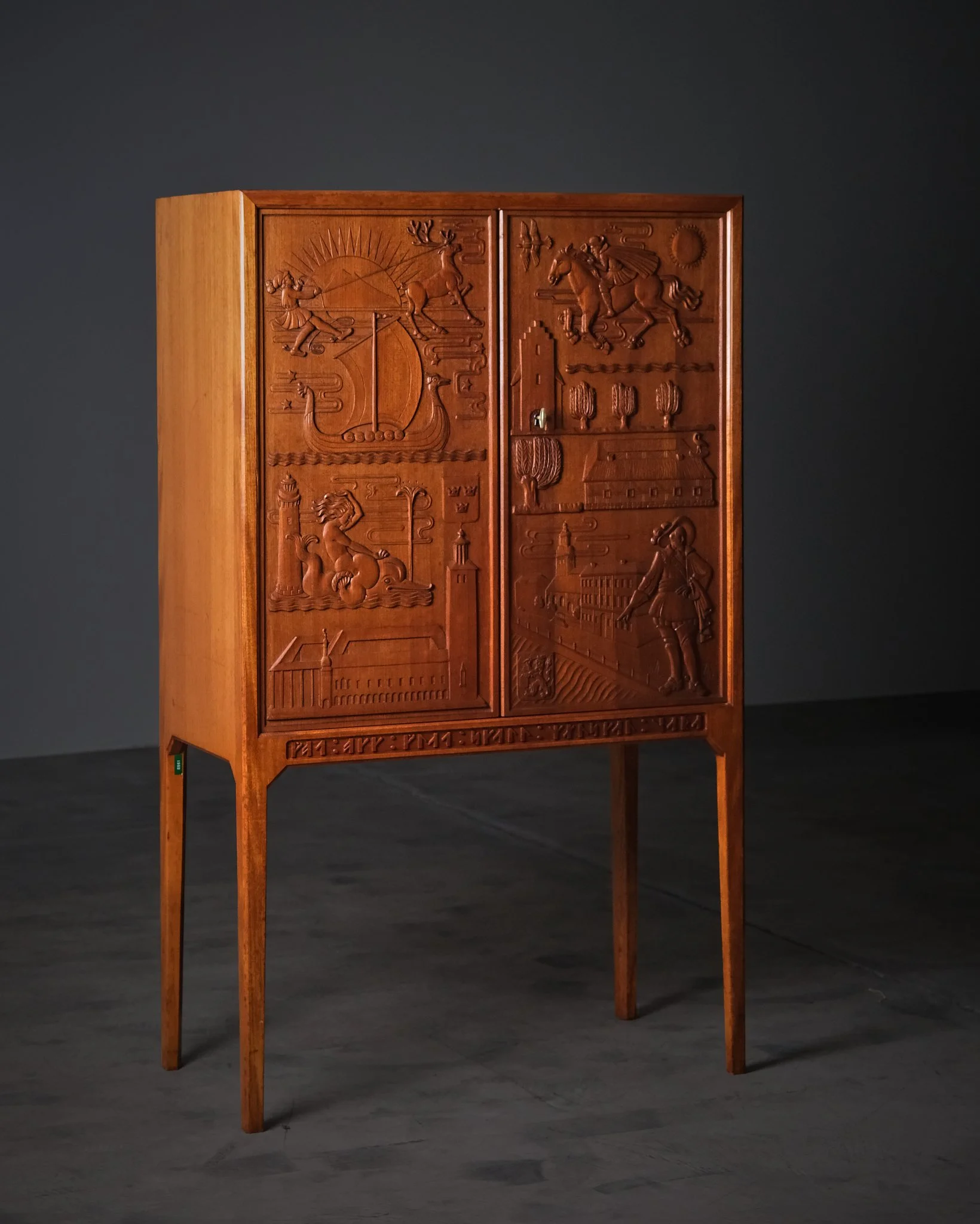A very rare bar cabinet designed by Ulla Fogelklou-Skogh and produced by Bodafors in Sweden during the 1940s. Executed in mahogany with details in brass and glass, the cabinet is a distinctive example of Swedish craftsmanship, combining sculptural decoration with refined joinery.