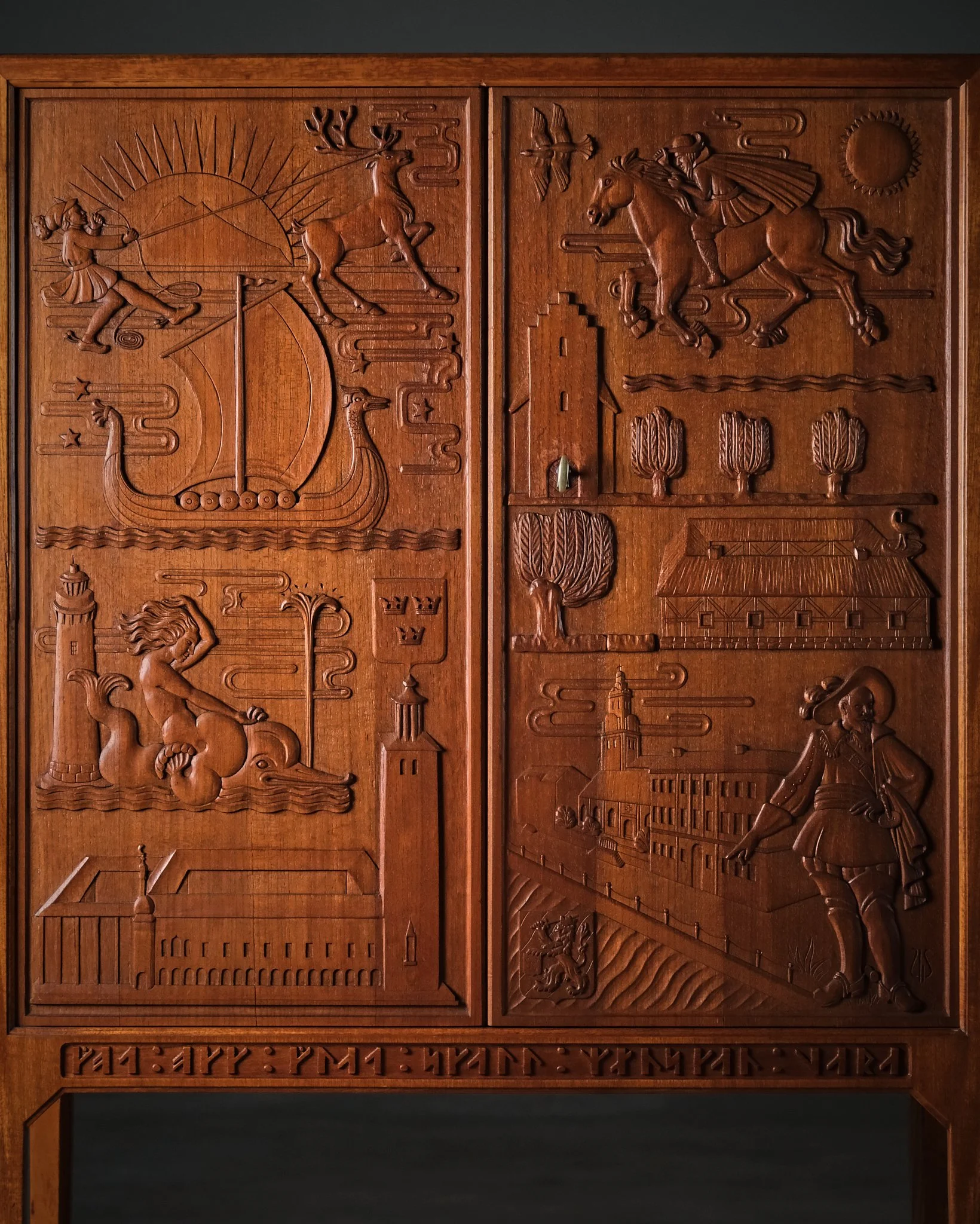The front is richly carved with figural and architectural motifs depicting Scandinavian scenes with mythological and historical references. Along the lower edge runs a carved runic inscription reading “Got okk glat skall manskan vara”, translated as “Good and happy man will be”, adding a poetic and distinctly Nordic character.
