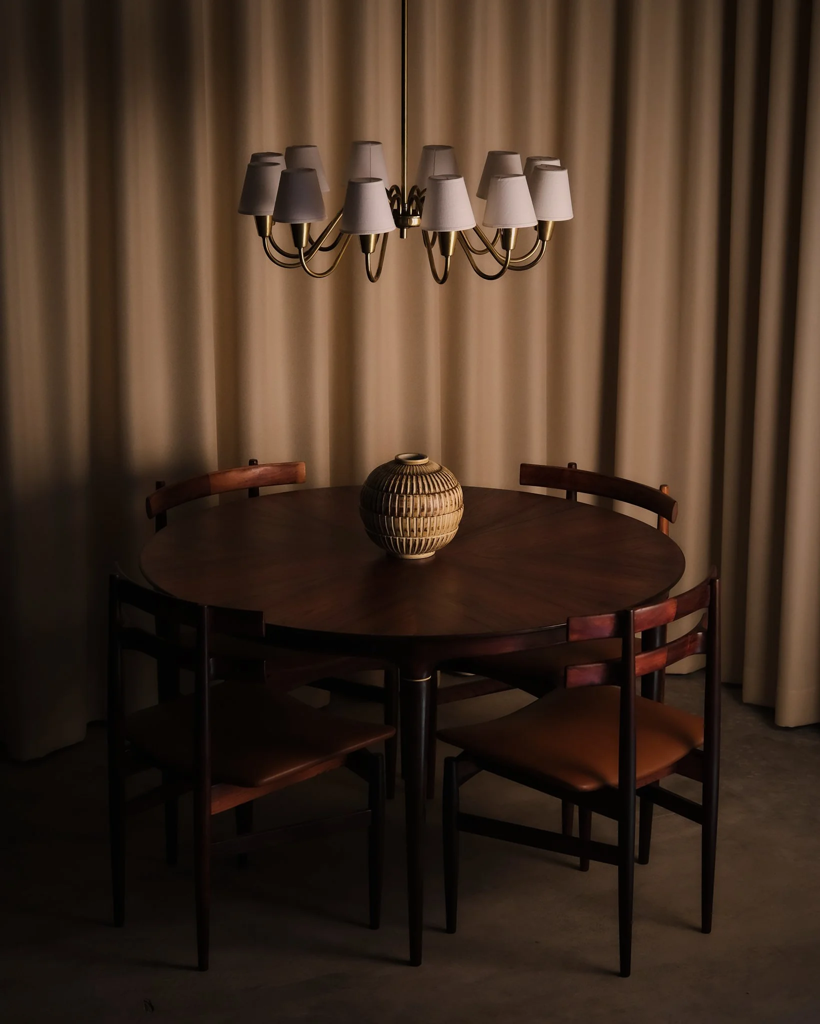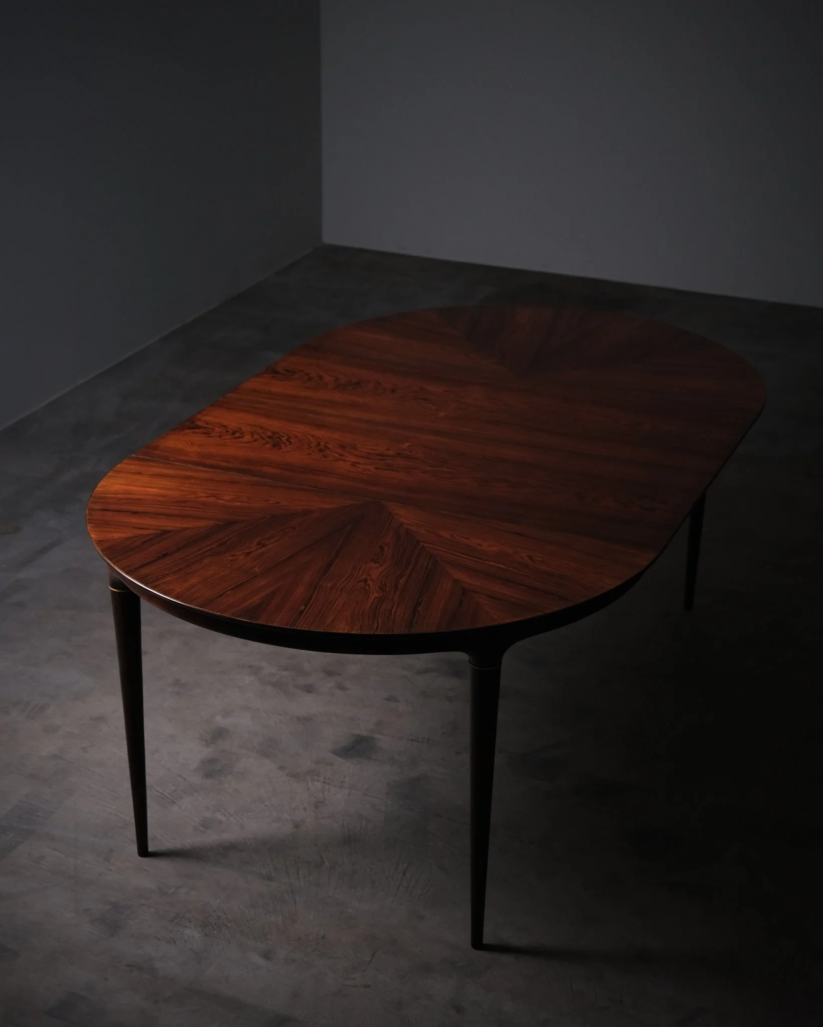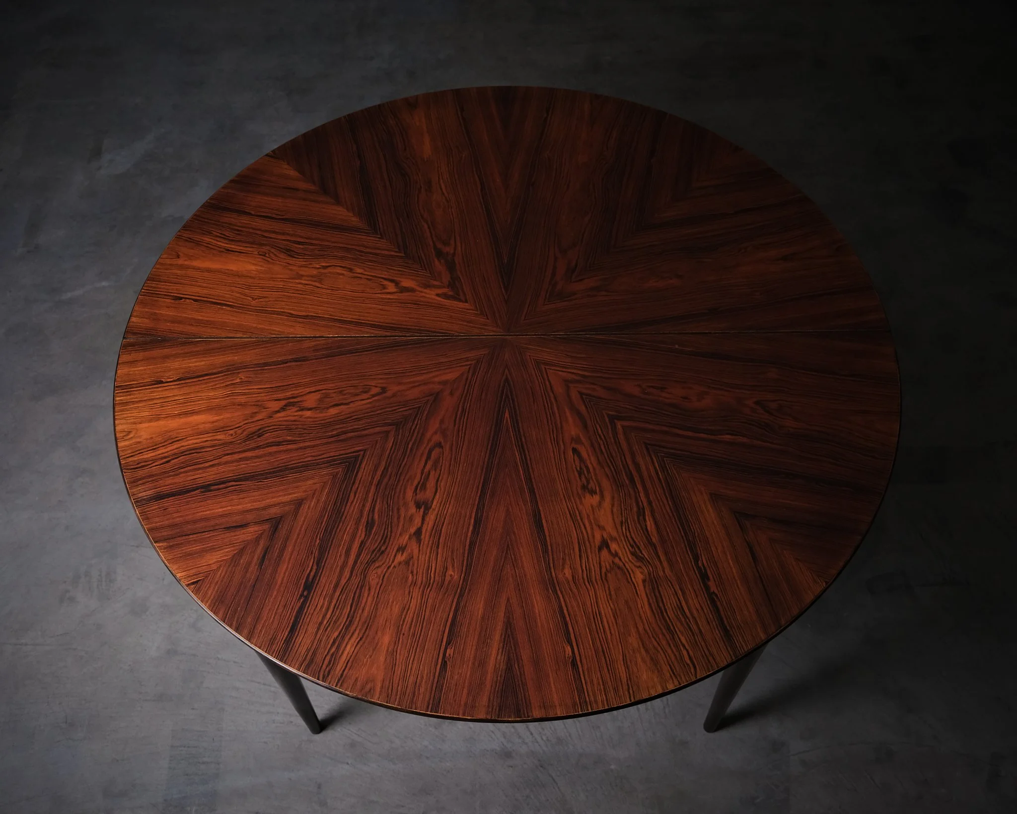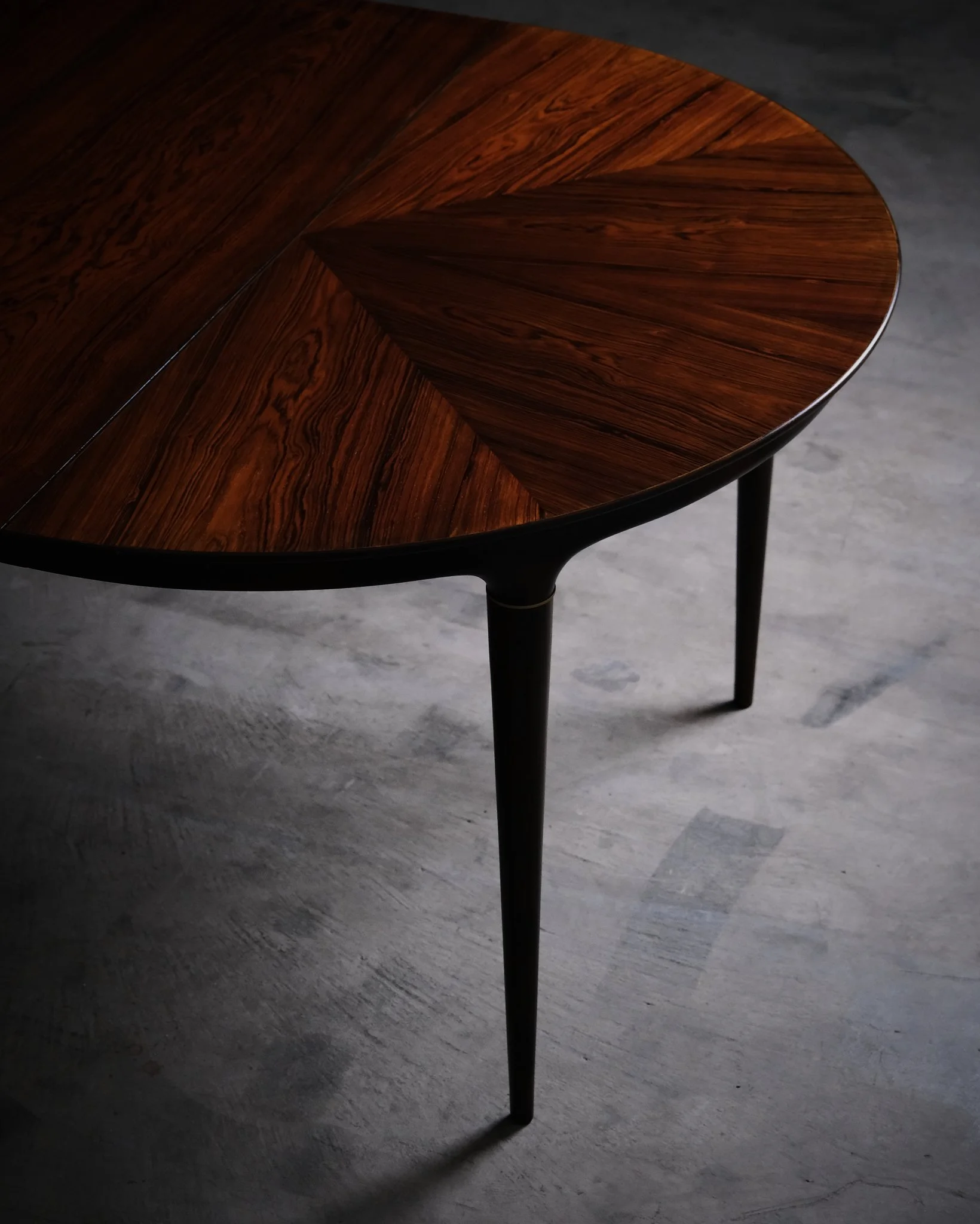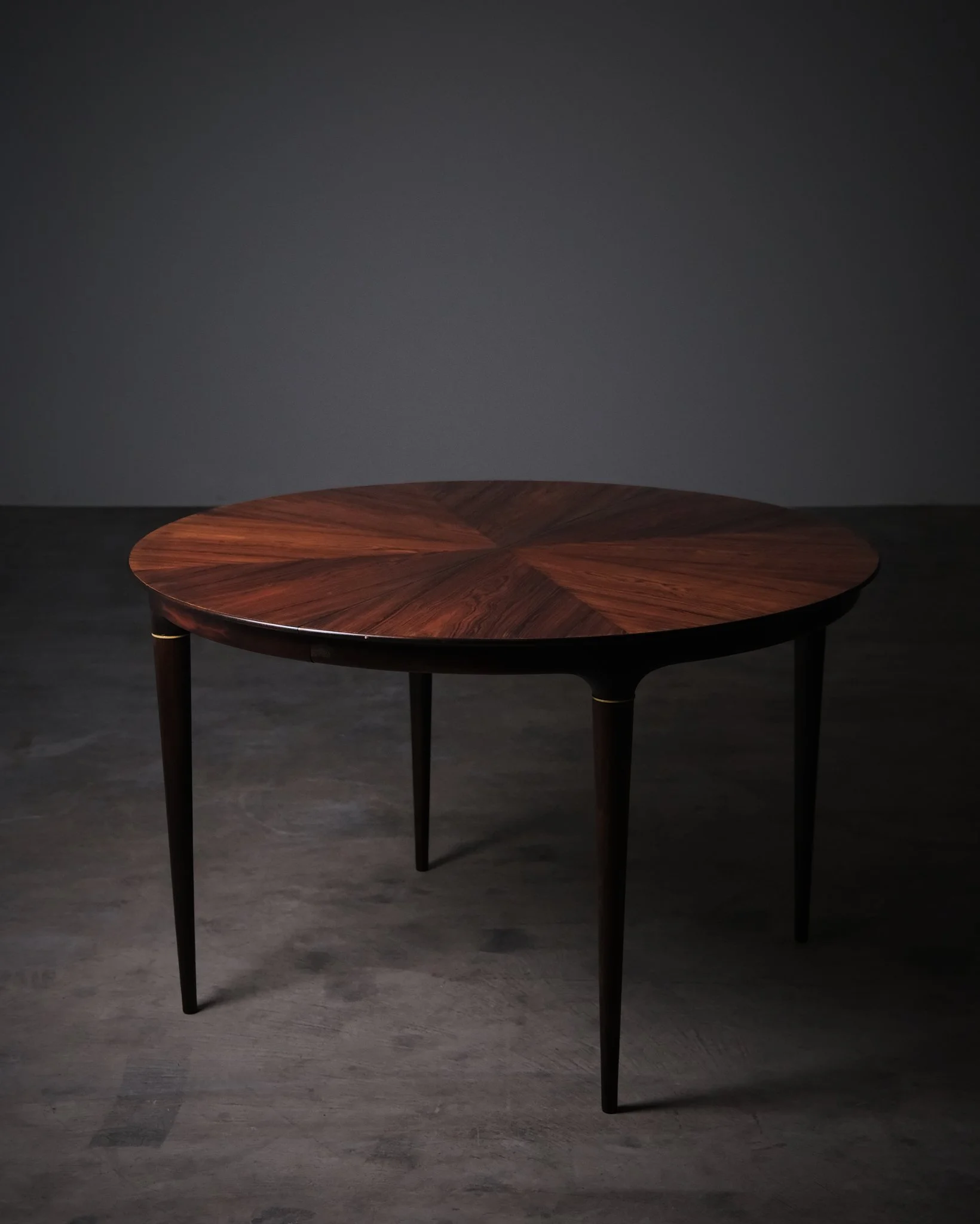 Round dining table in rosewood with a richly figured radial veneer pattern. Elegant, slender legs with brass details. Comes with two 40 cm extension leaves, allowing for a flexible size depending on use. Fully extended, the table measures 198 cm in length.