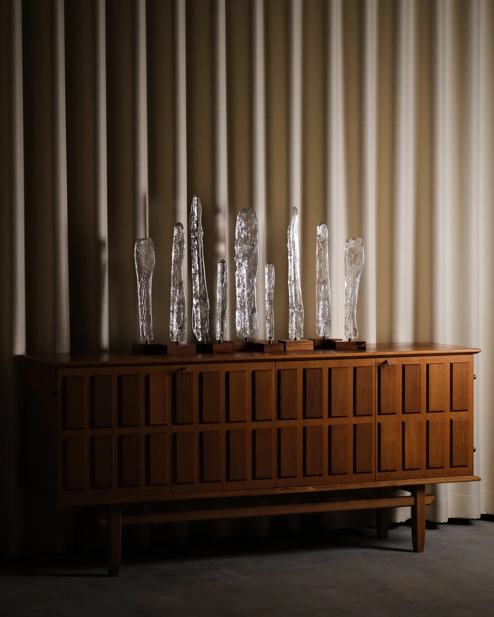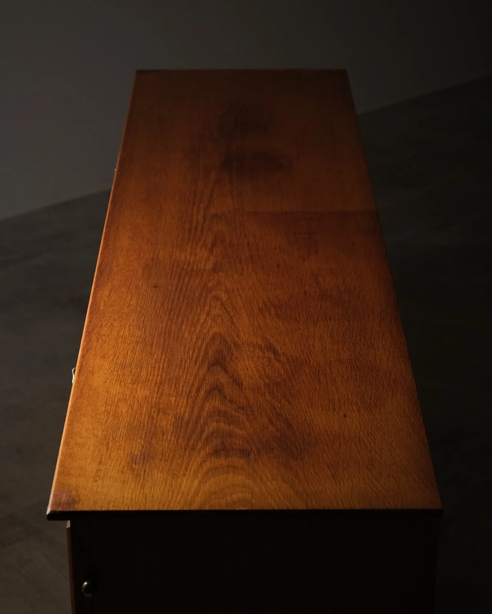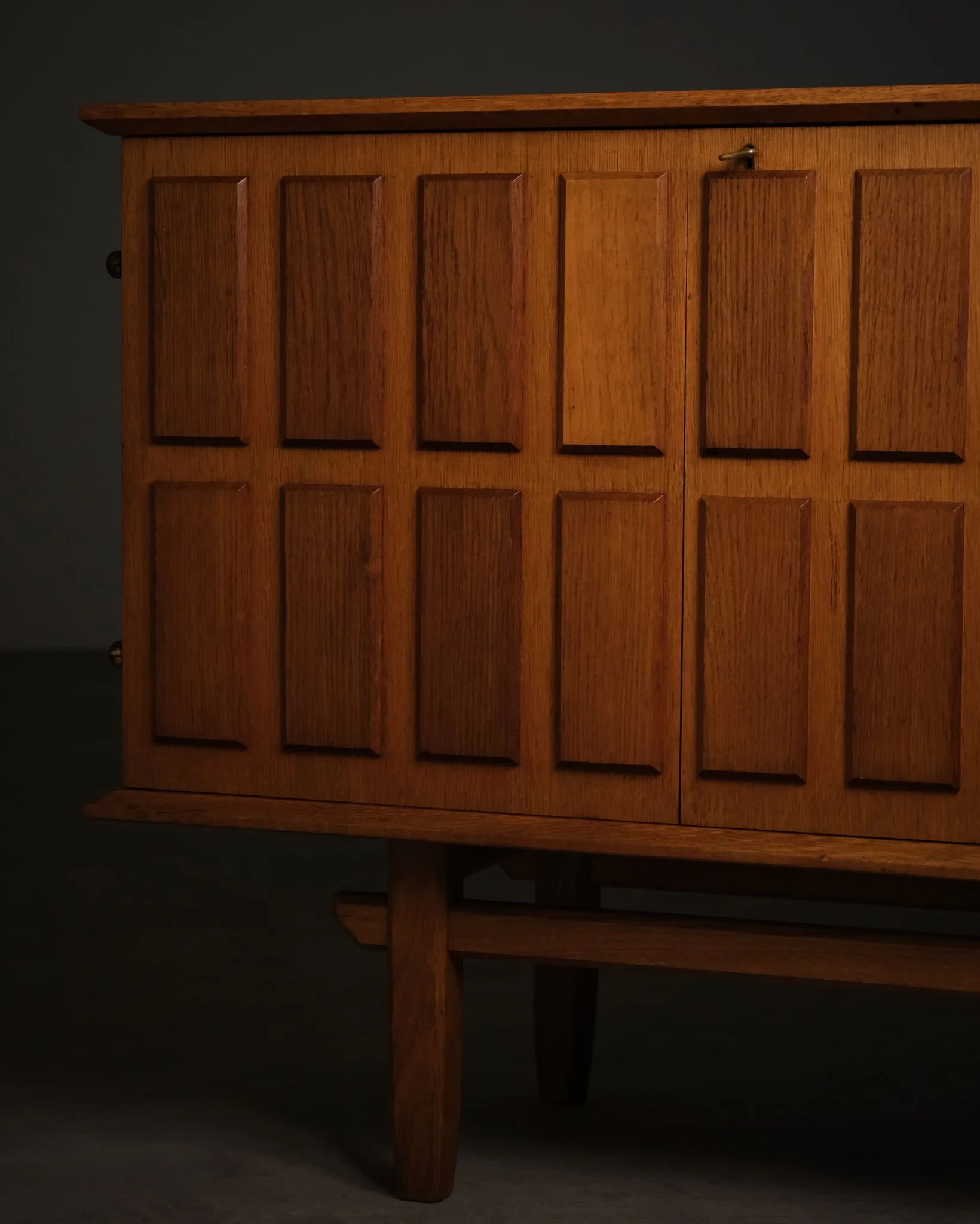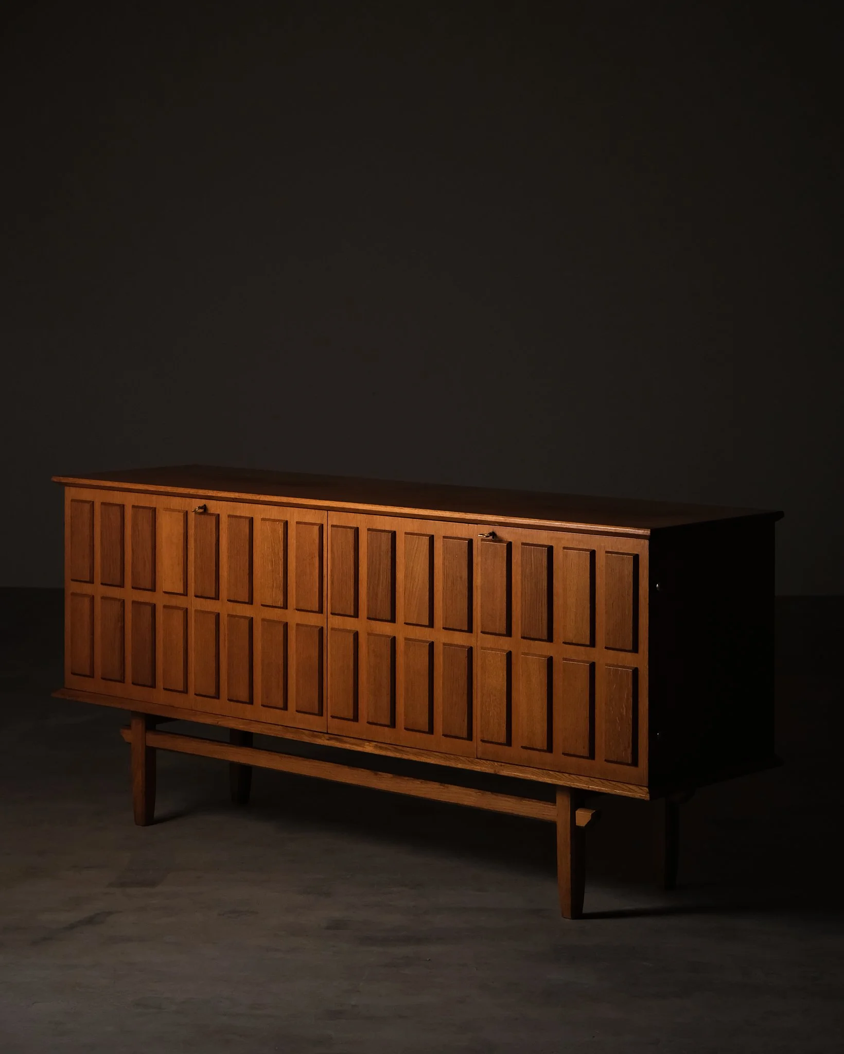 A substantial oak sideboard designed by Eyvind Beckman, featuring a distinctive cassette-patterned front that creates a rhythmic and architectural expression. The warm tone of the oak is complemented by refined brass fittings, adding a subtle contrast. Raised on a solid base with stretcher, giving the piece a balanced and grounded presence.