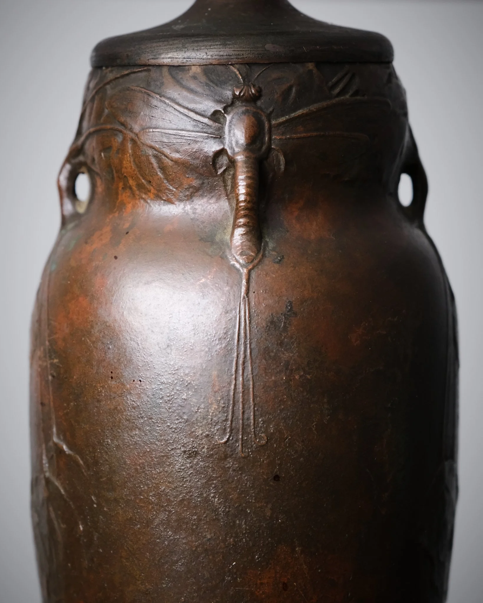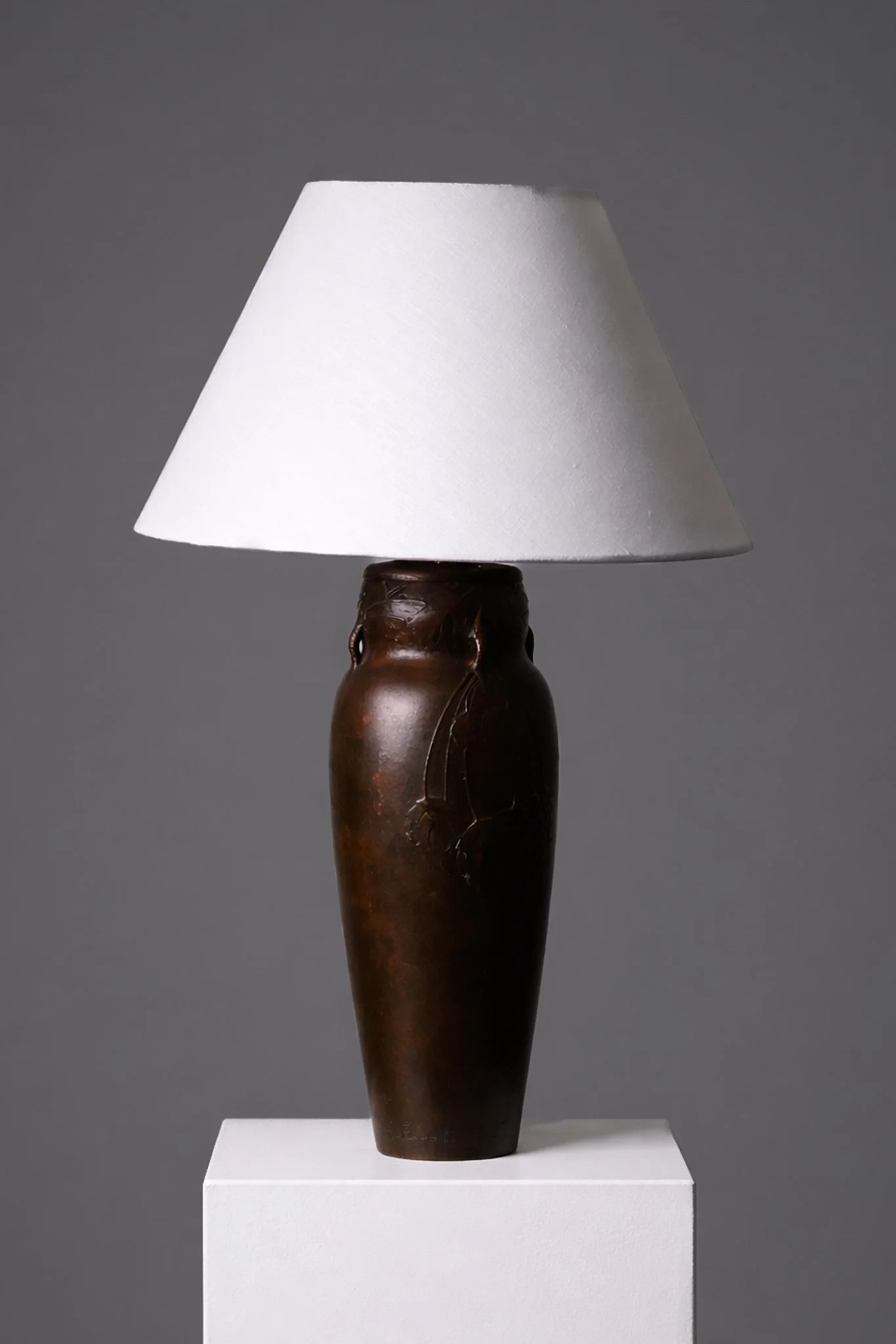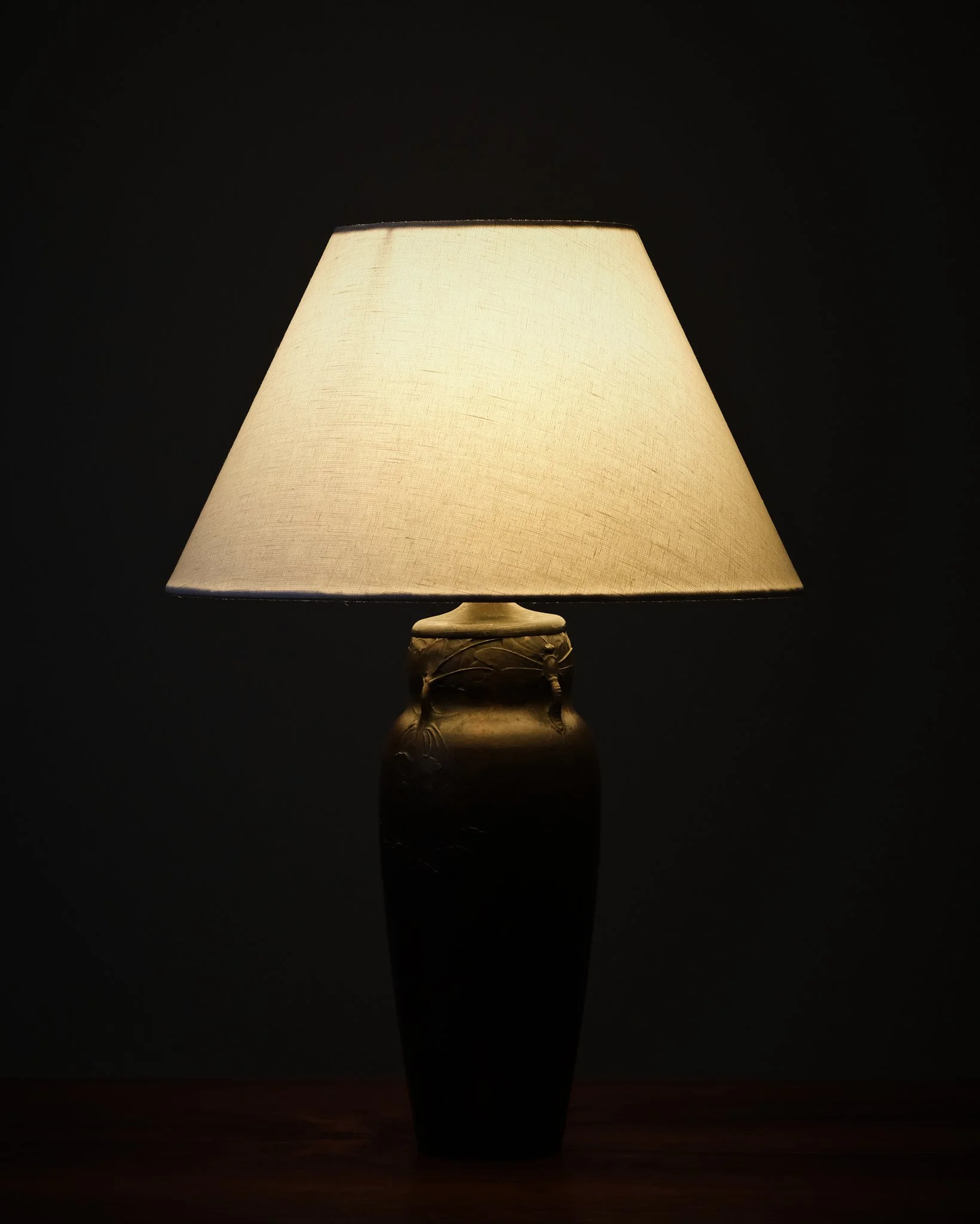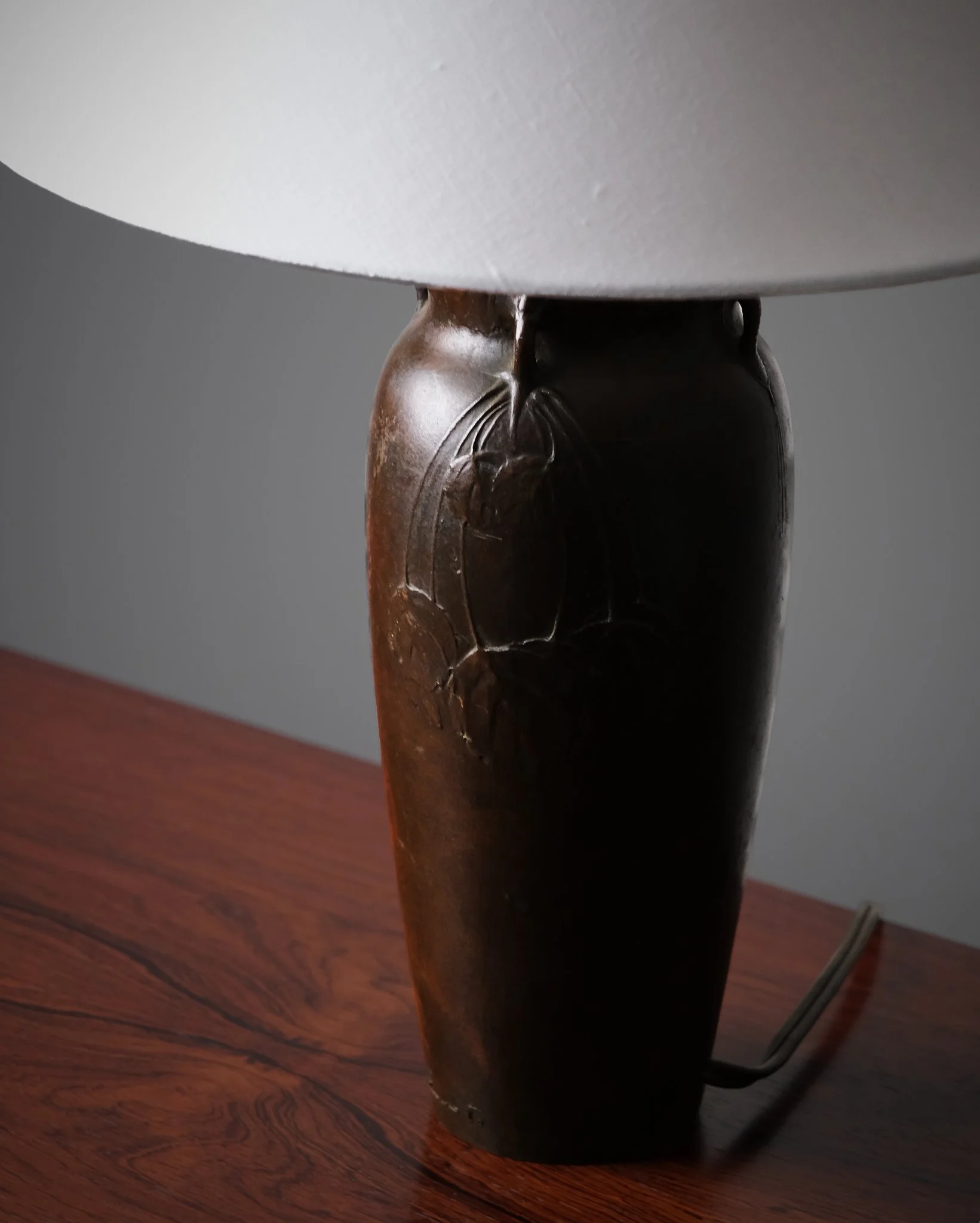 Bronze table lamp by Hugo Elmqvist, produced in Sweden during the early 20th century. The sculptural base is decorated with finely modeled reliefs of dragonflies and foliage, lending a subtle organic character. Marked underneath and signed.