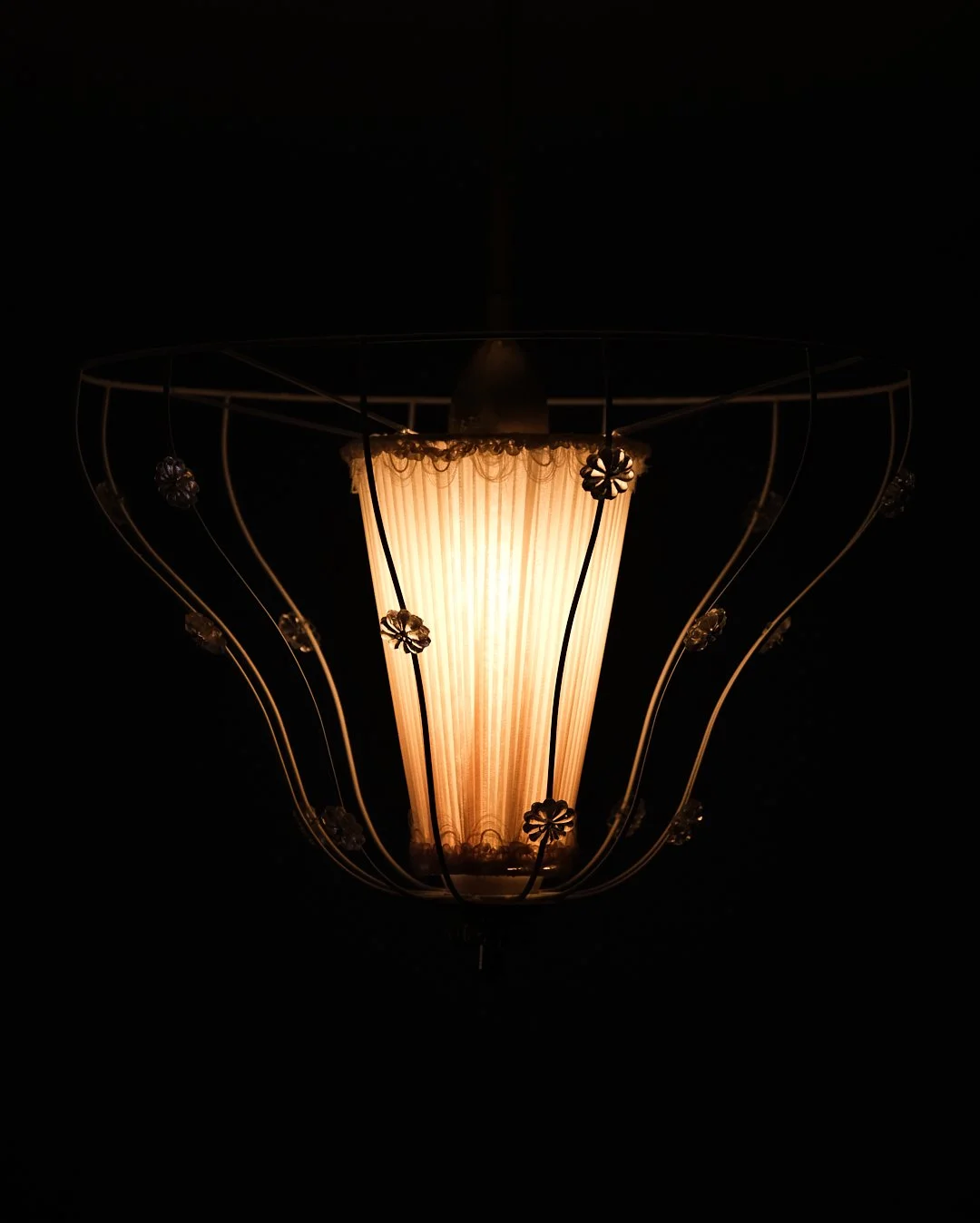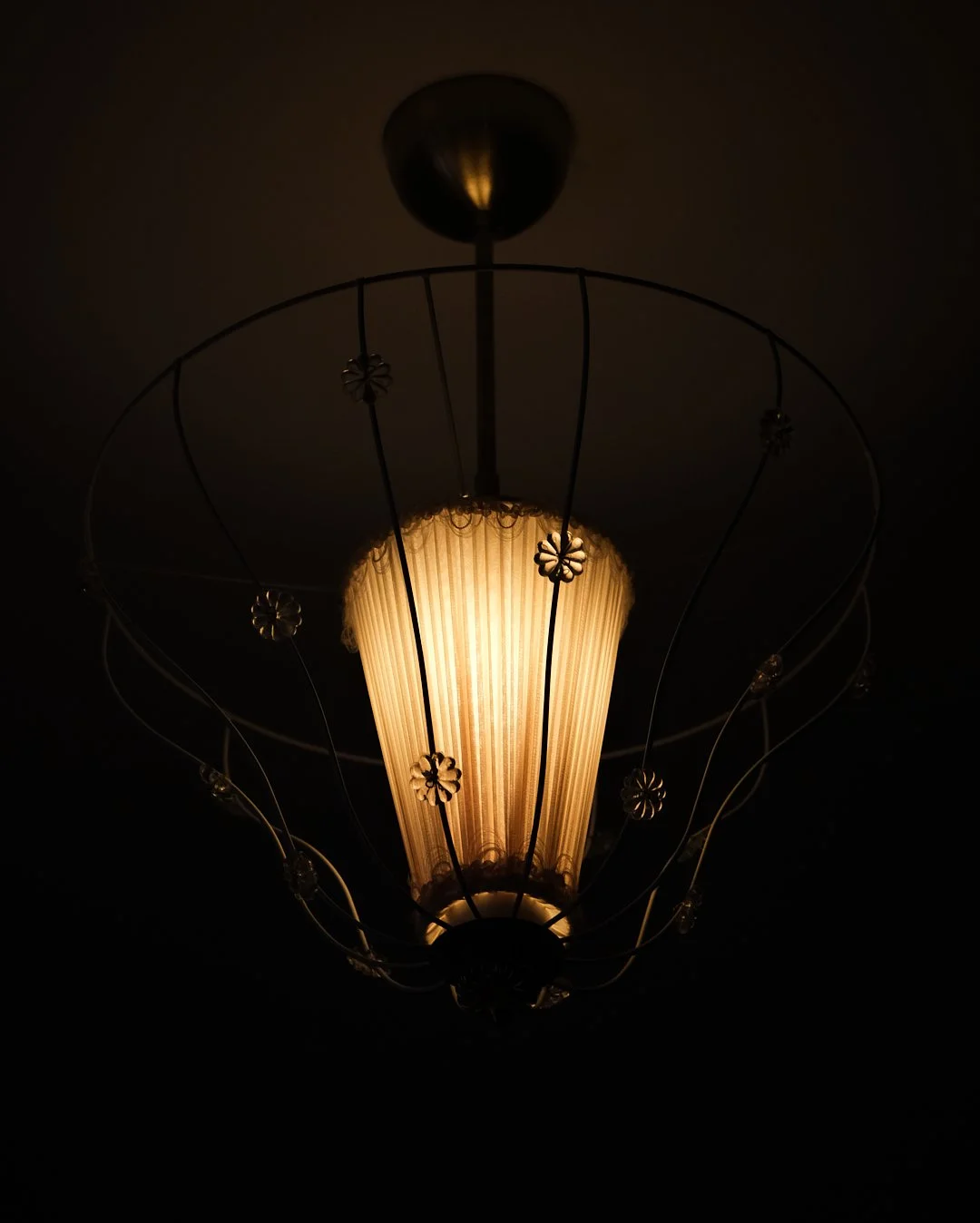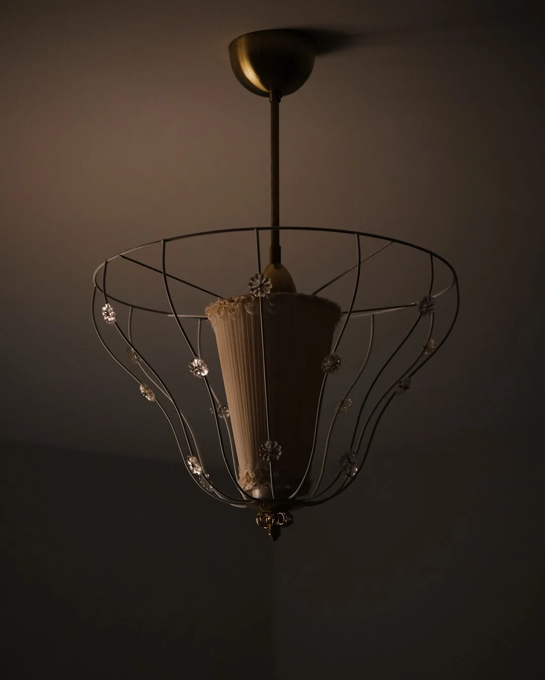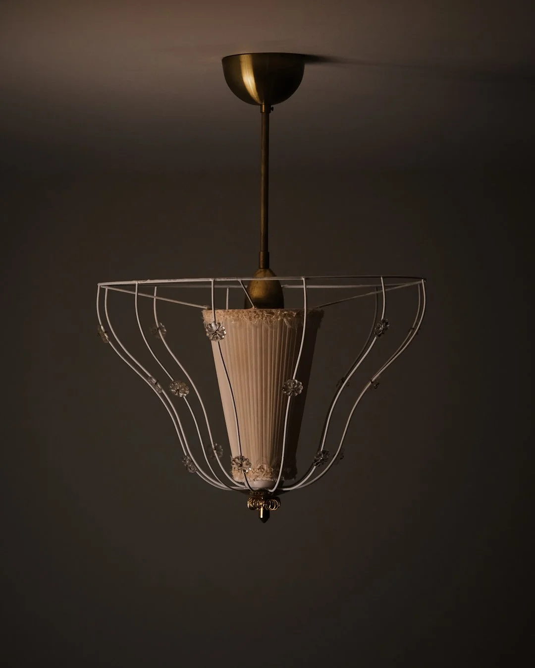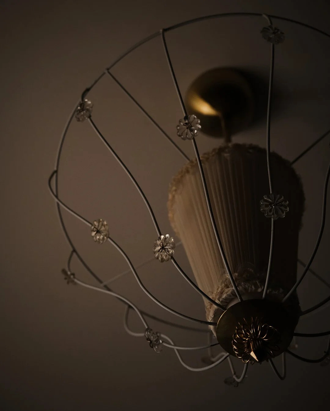 Ceiling lamp in an unusual cage form with decorative glass flowers attached to the curved metal wires. A pleated fabric shade conceals the light source, casting an atmospheric glow that illuminates the delicate floral ornaments. Brass fittings at the canopy and stem add a refined accent.
