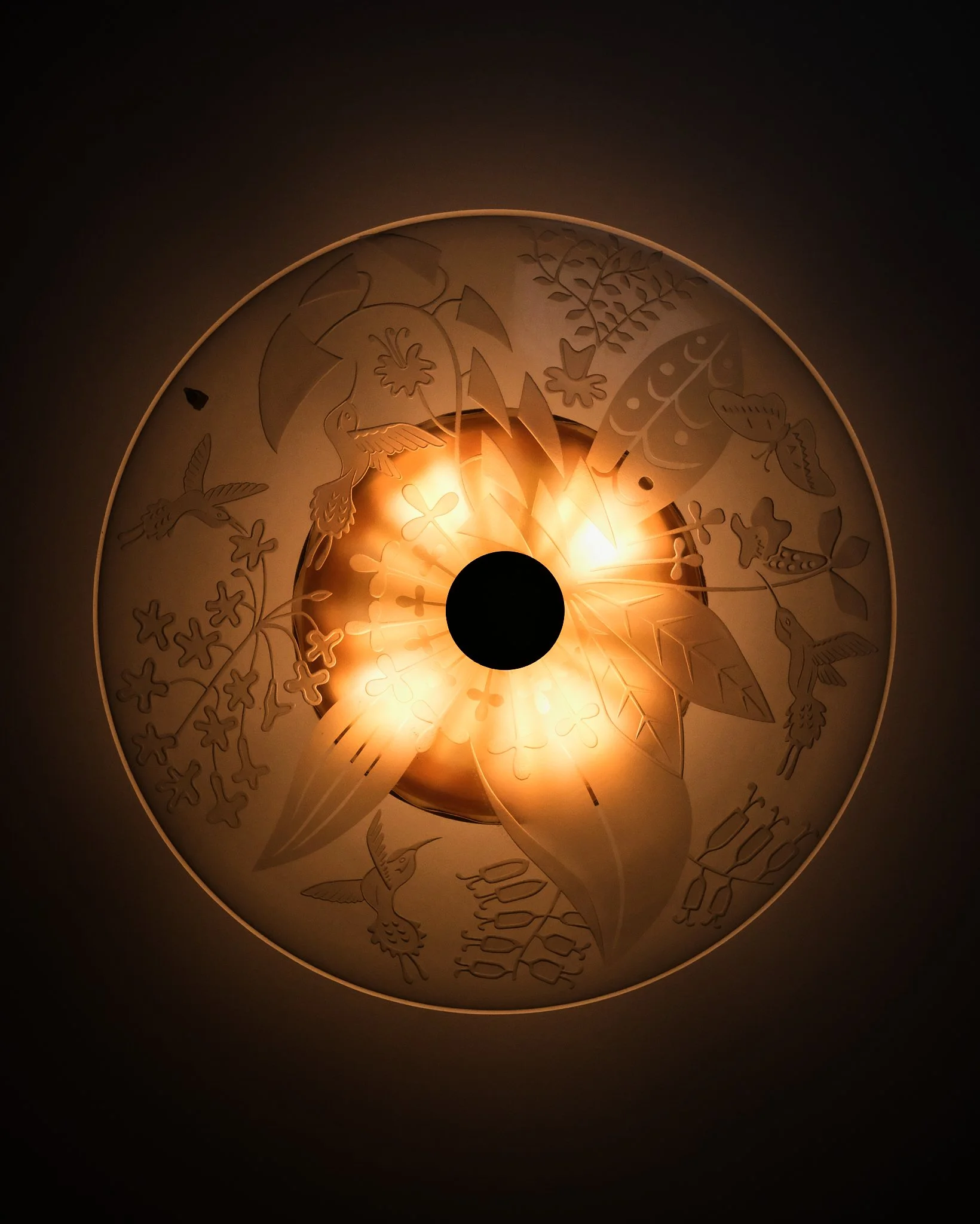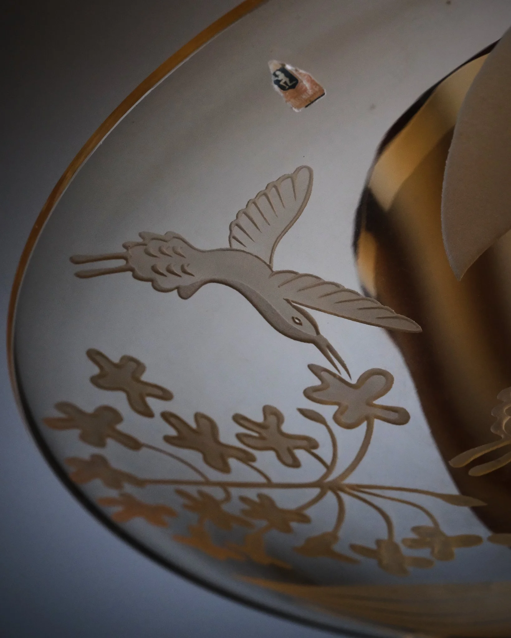 This refined piece features a delicately etched glass shade adorned with birds and foliage, set against a warm amber-colored inner glass that creates a subtle, atmospheric glow. The combination of natural motifs and exquisite craftsmanship exemplifies the sophisticated Swedish design of the era.