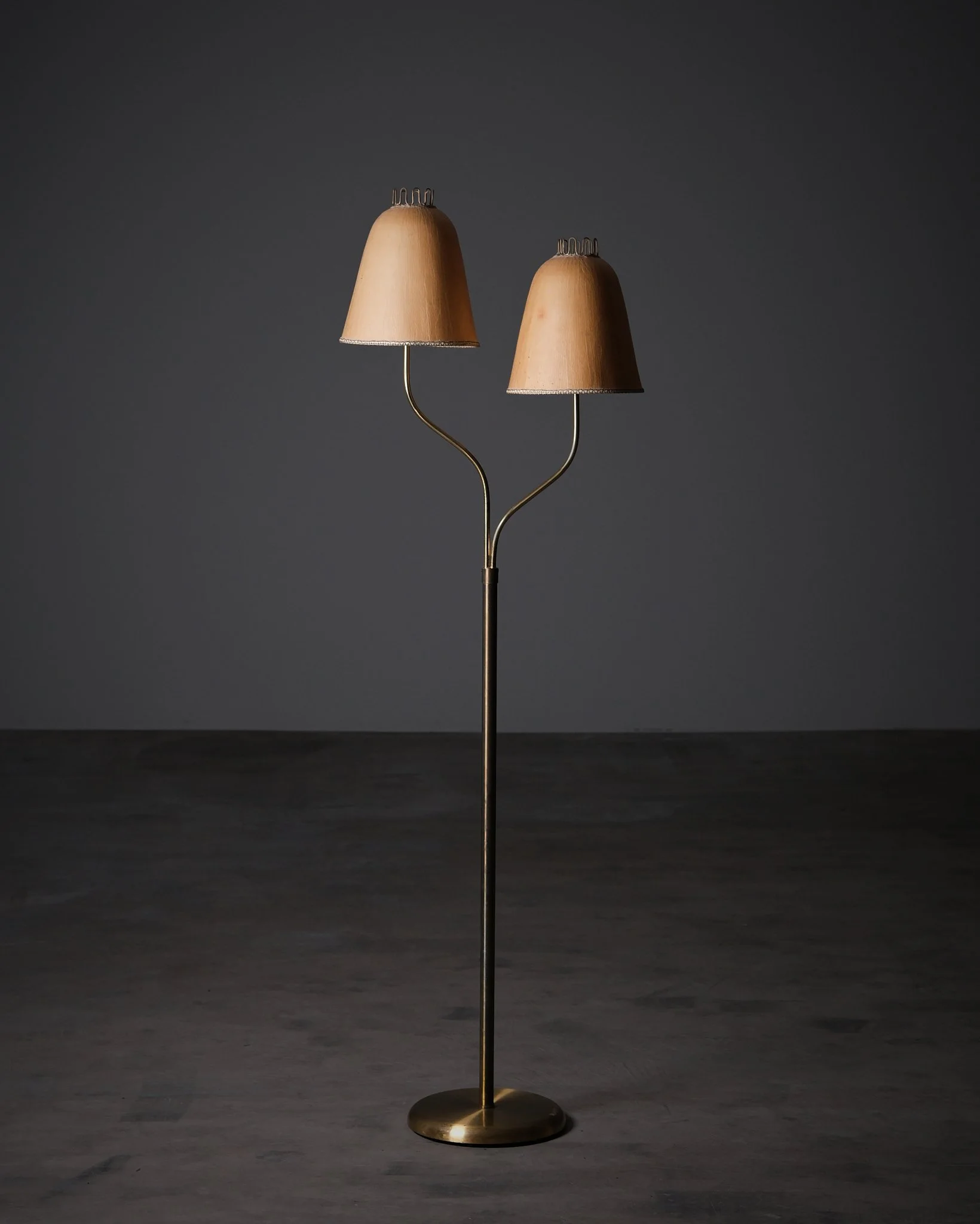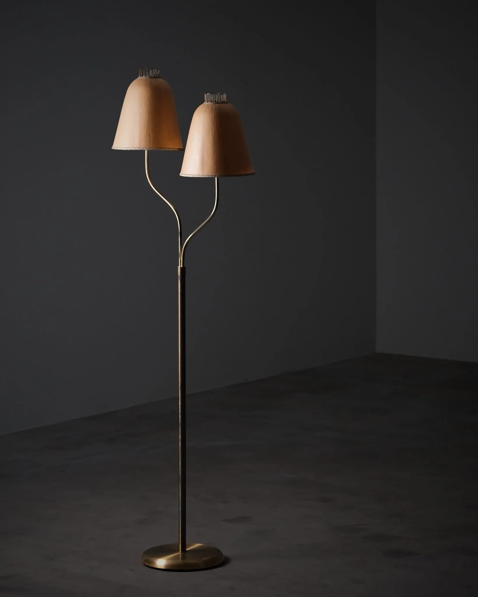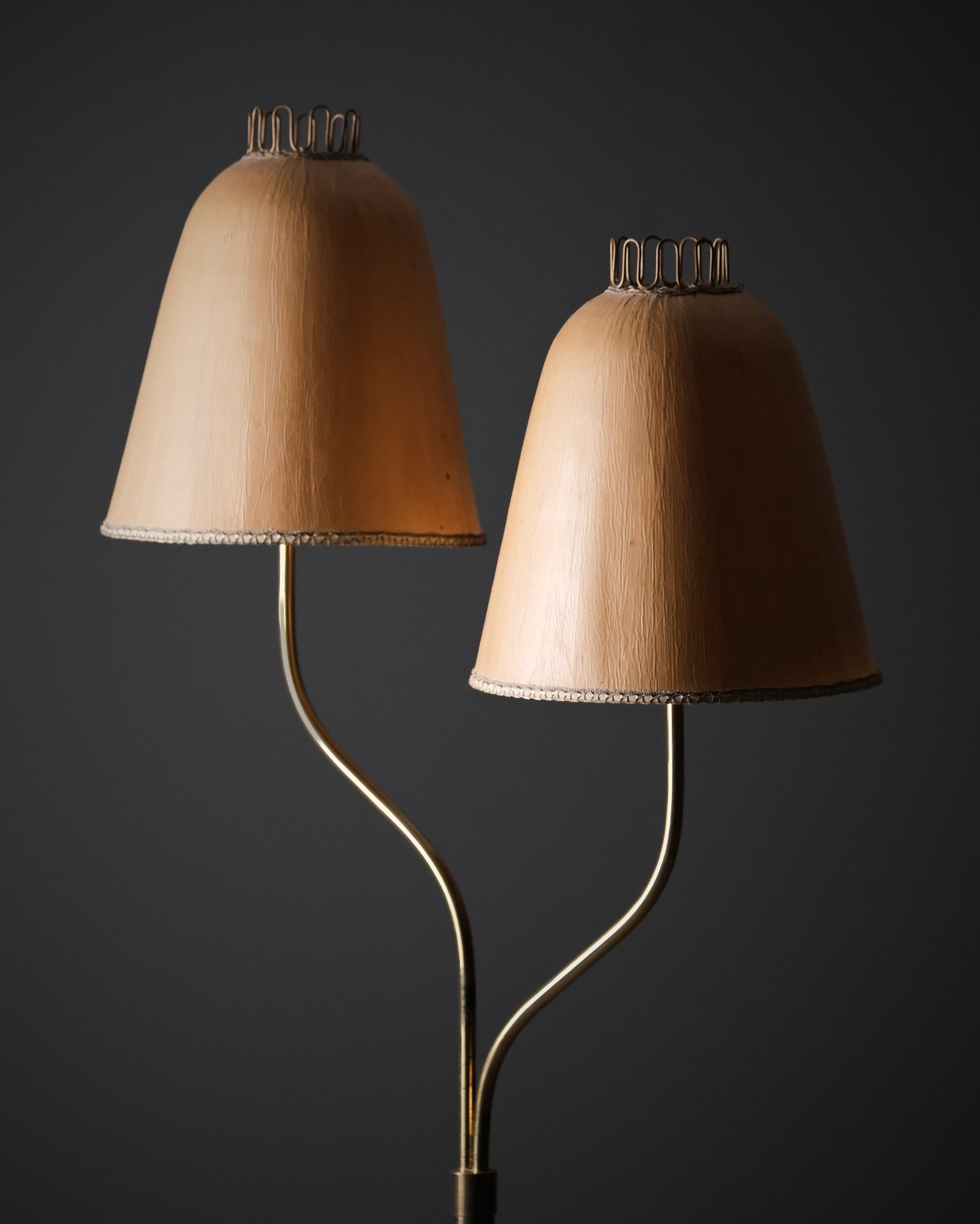 Rare floor lamp with a brass structure and two sculptural, branching arms. The balanced composition gives the piece a light, architectural presence. Parchment shades, each finished with small crown-like brass details at the top. A restrained and characterful example of Swedish lighting design from the 1940s.