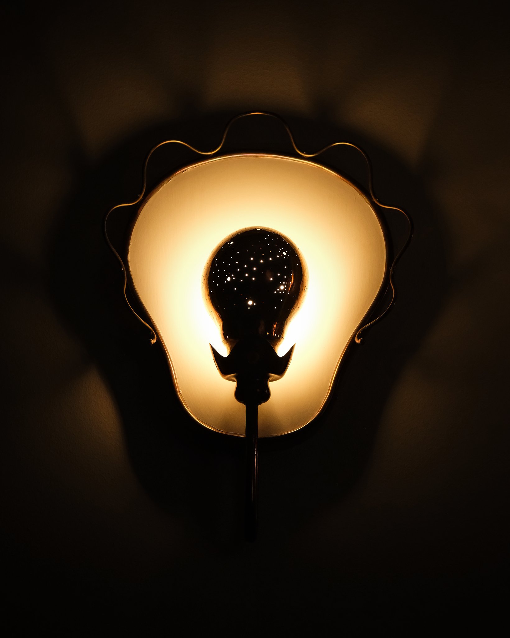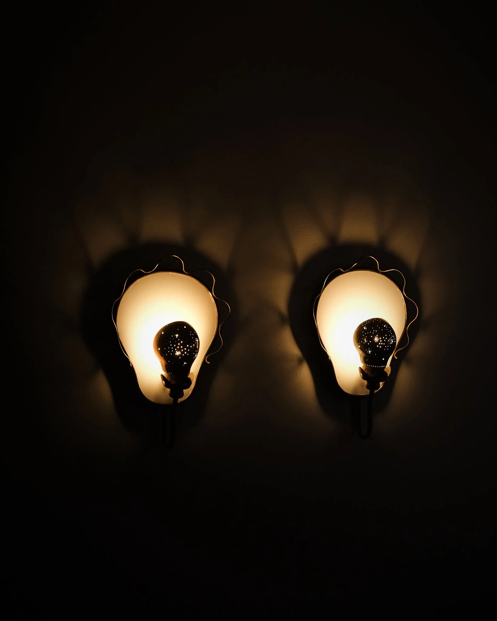 A pair of striking wall lamps from the early 1940s, produced for Brukshotellet in Wikmanshyttan, inaugurated in 1943. Possibly unique. Despite the unknown designer and maker, the lamps show a high level of craftsmanship and a clear sensitivity to form and light.