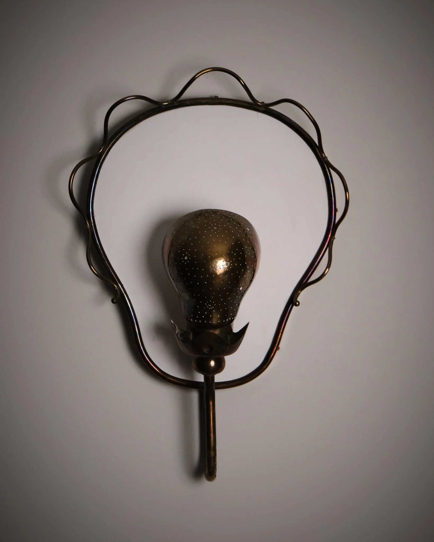 Executed in brass and lacquered metal. The perforated shade creates a delicate, patterned light, while the white lacquered metal backplate softly reflects the glow, giving both a gentle and atmospheric effect. Refined brass details throughout.