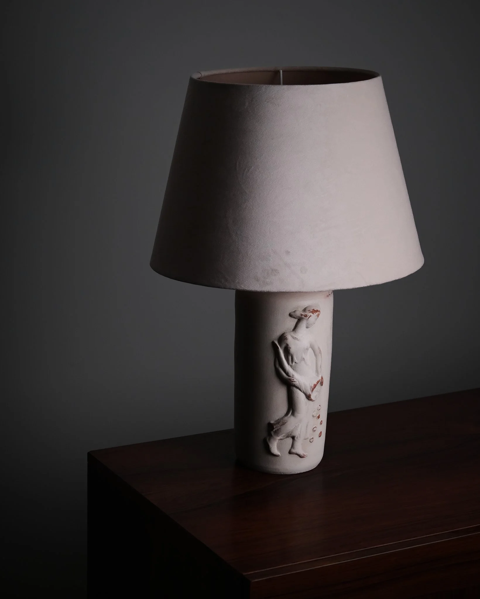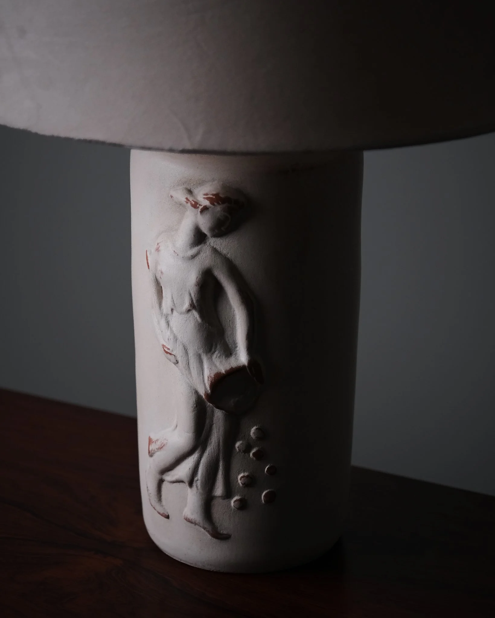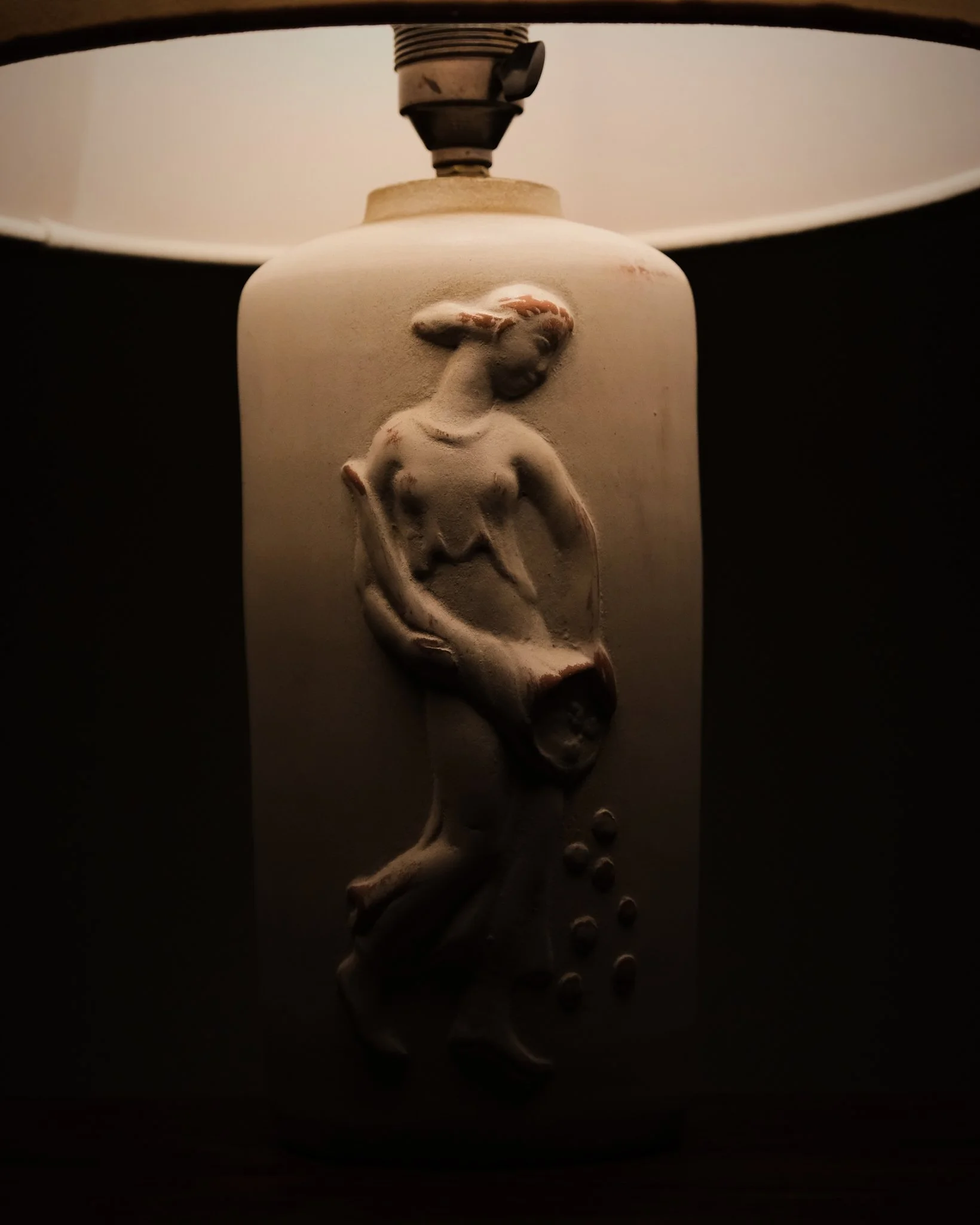 A table lamp by an unknown Swedish designer, crafted by Bjerkås Armatur in the 1940s. Ceramic base with a relief depicting a woman, characteristic of the Swedish Grace period. An uncommon model seldom seen on the market.