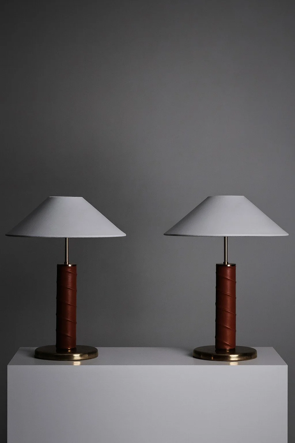 The lamps feature cylindrical bases wrapped in cognac-coloured leather with brass details, giving a warm and natural expression. Suitable for use on a sideboard, desk, or bedside table.