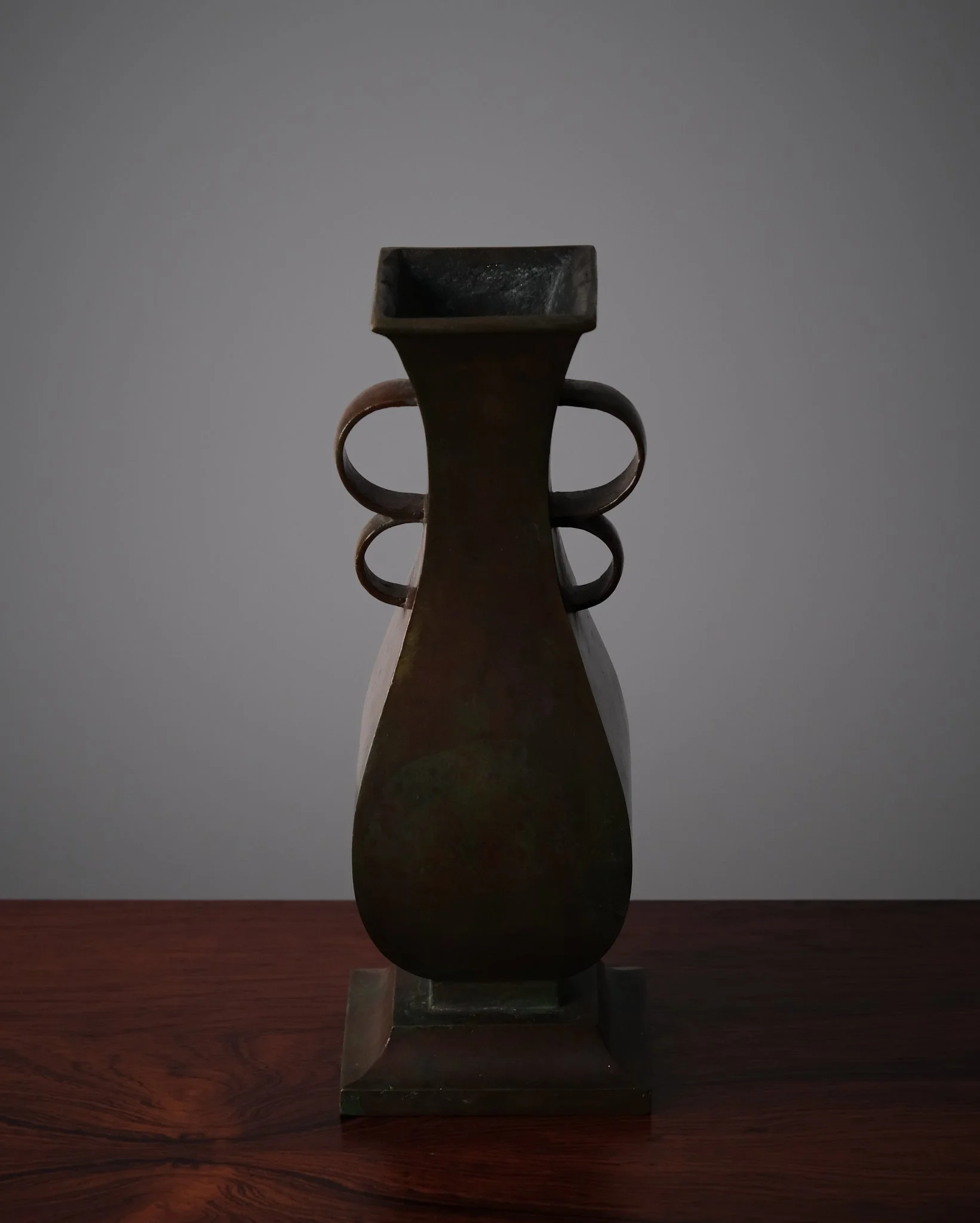 Large Art Deco bronze vase, model 9017, produced by Sune Bäckström in Malmö, southern Sweden, in the early 20th century. A substantial and well-balanced form with four distinctive handles and a beautifully aged surface. Finished with an attractive patina in warm brown and green tones. Marked underneath with the maker’s stamp and model number.