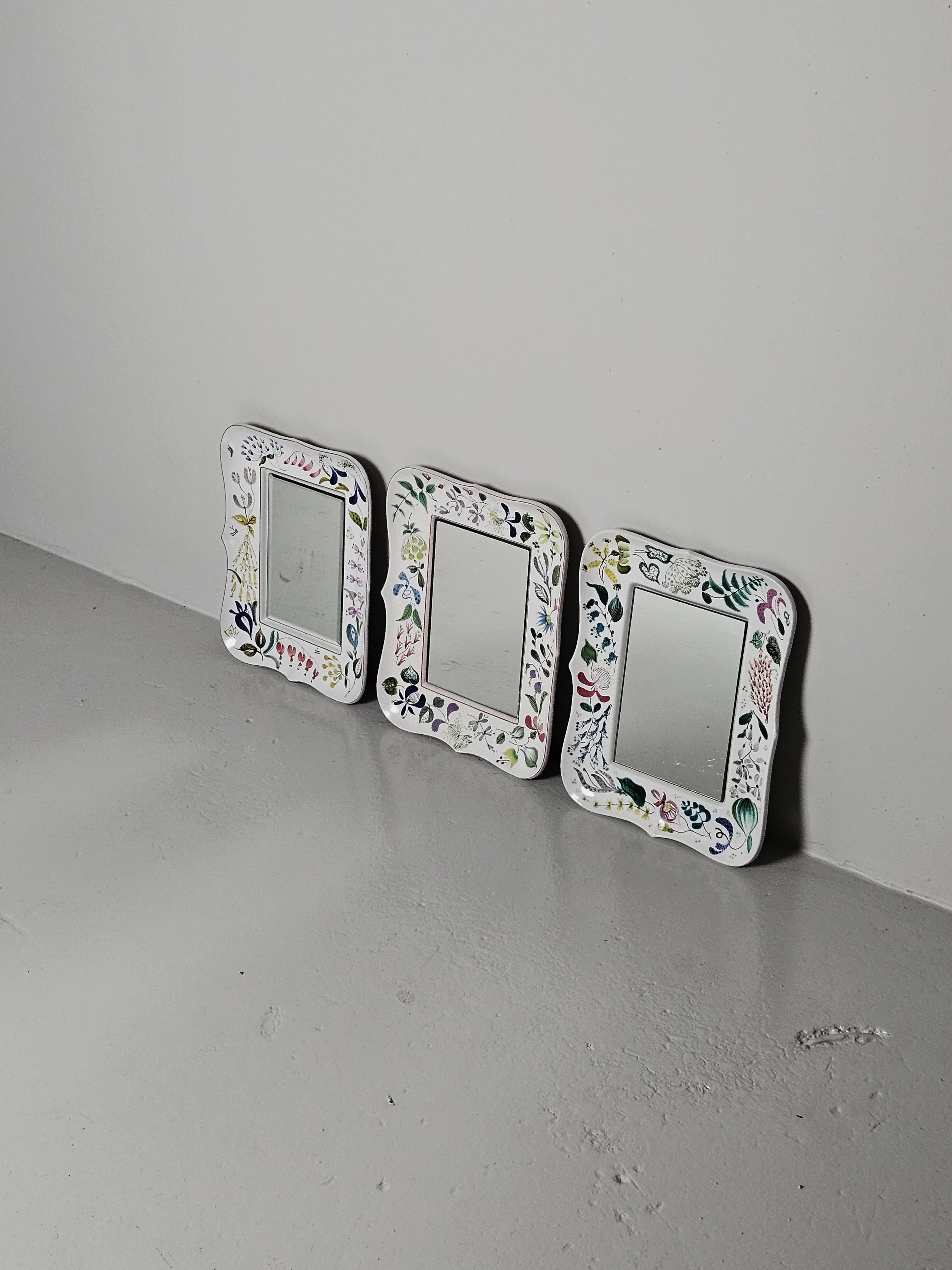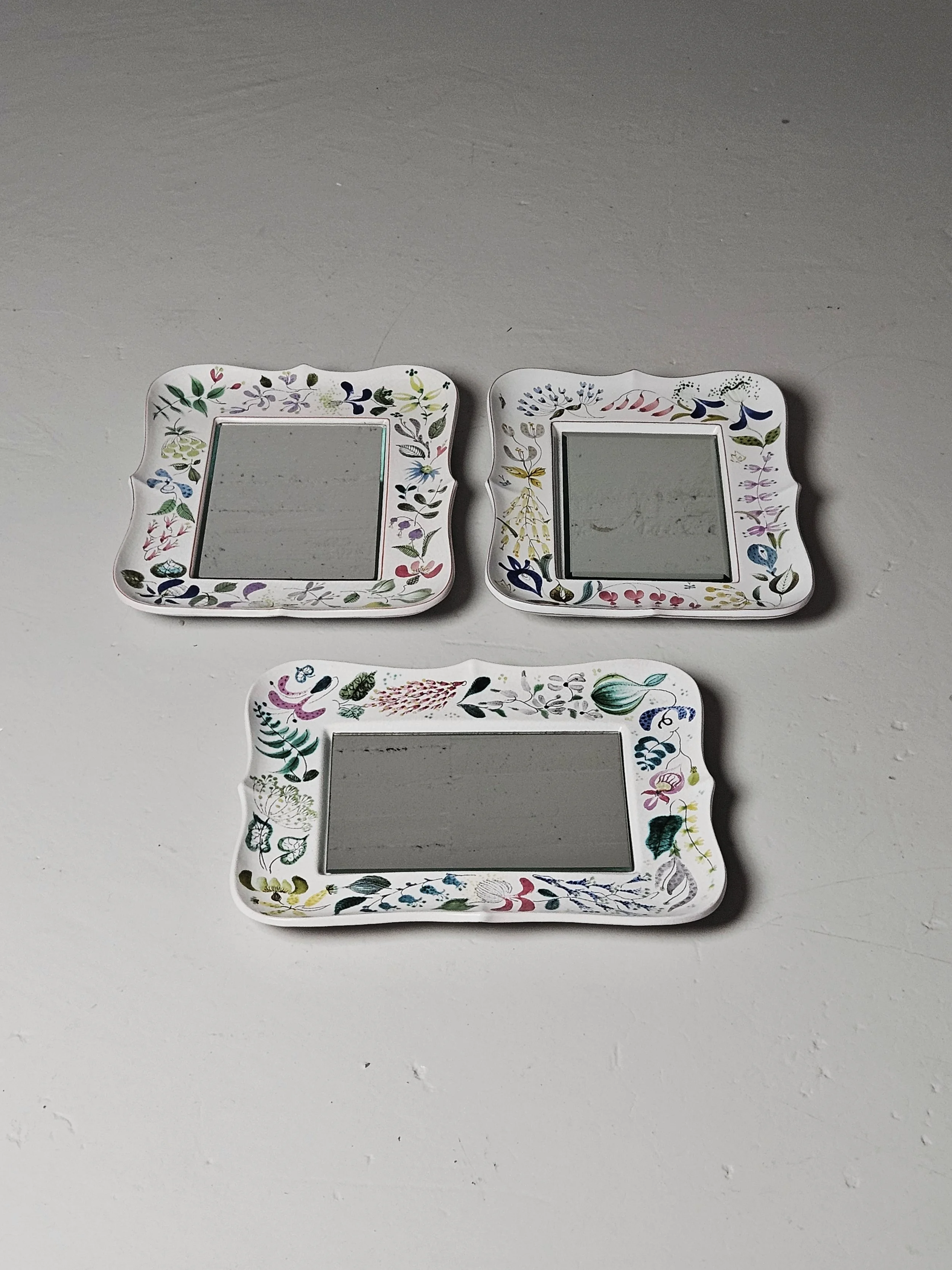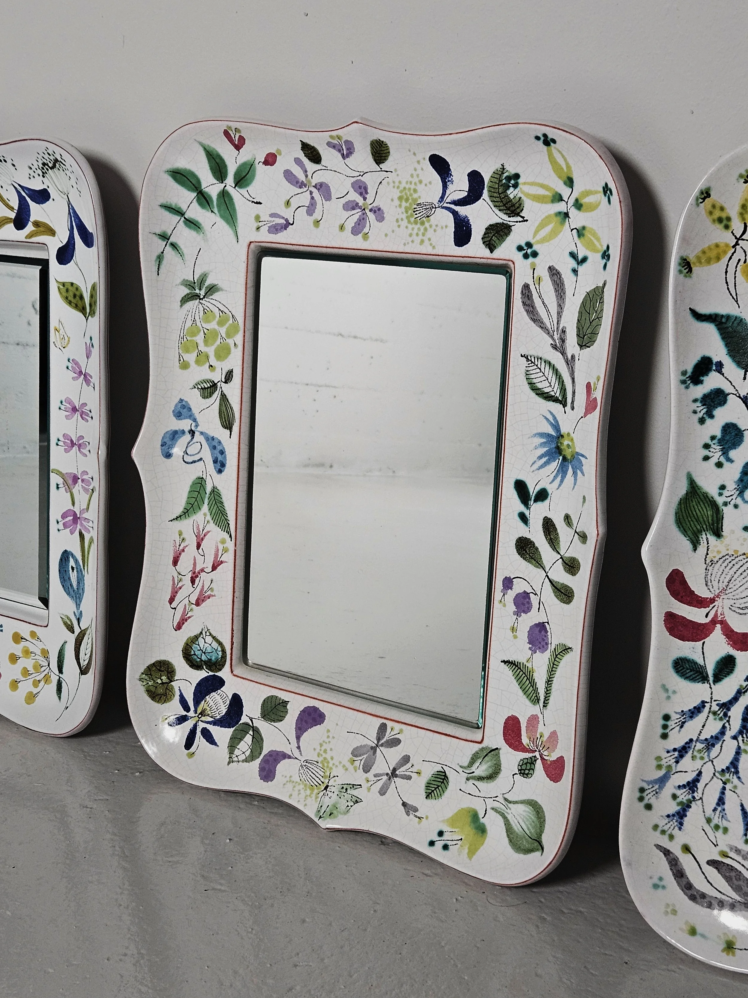 Lovely faience wall mirrors designed by Stig Lindberg. Everyone of the mirrors has a different floral painting on them. It is possible to hang the mirror horizontally as well as vertically