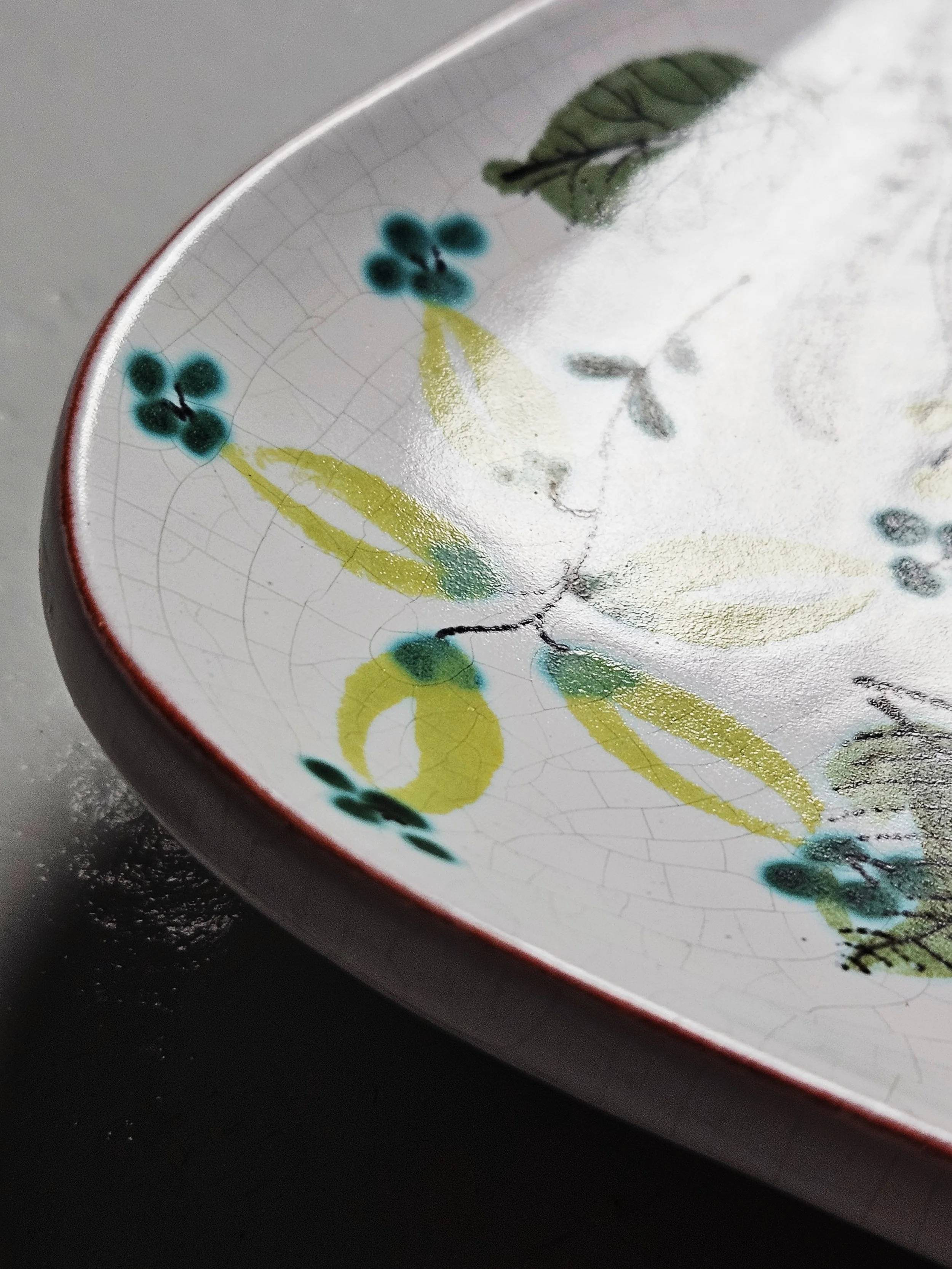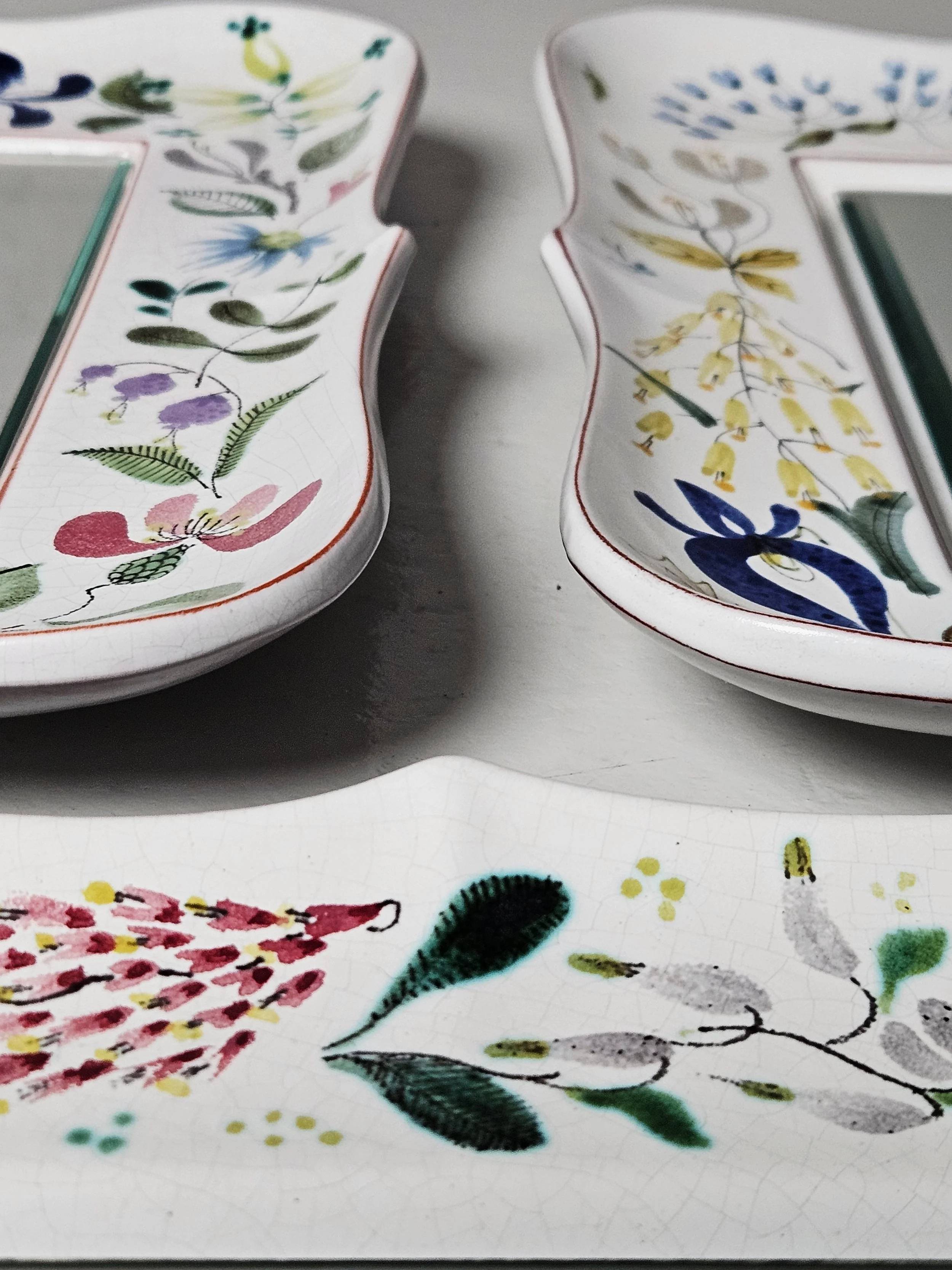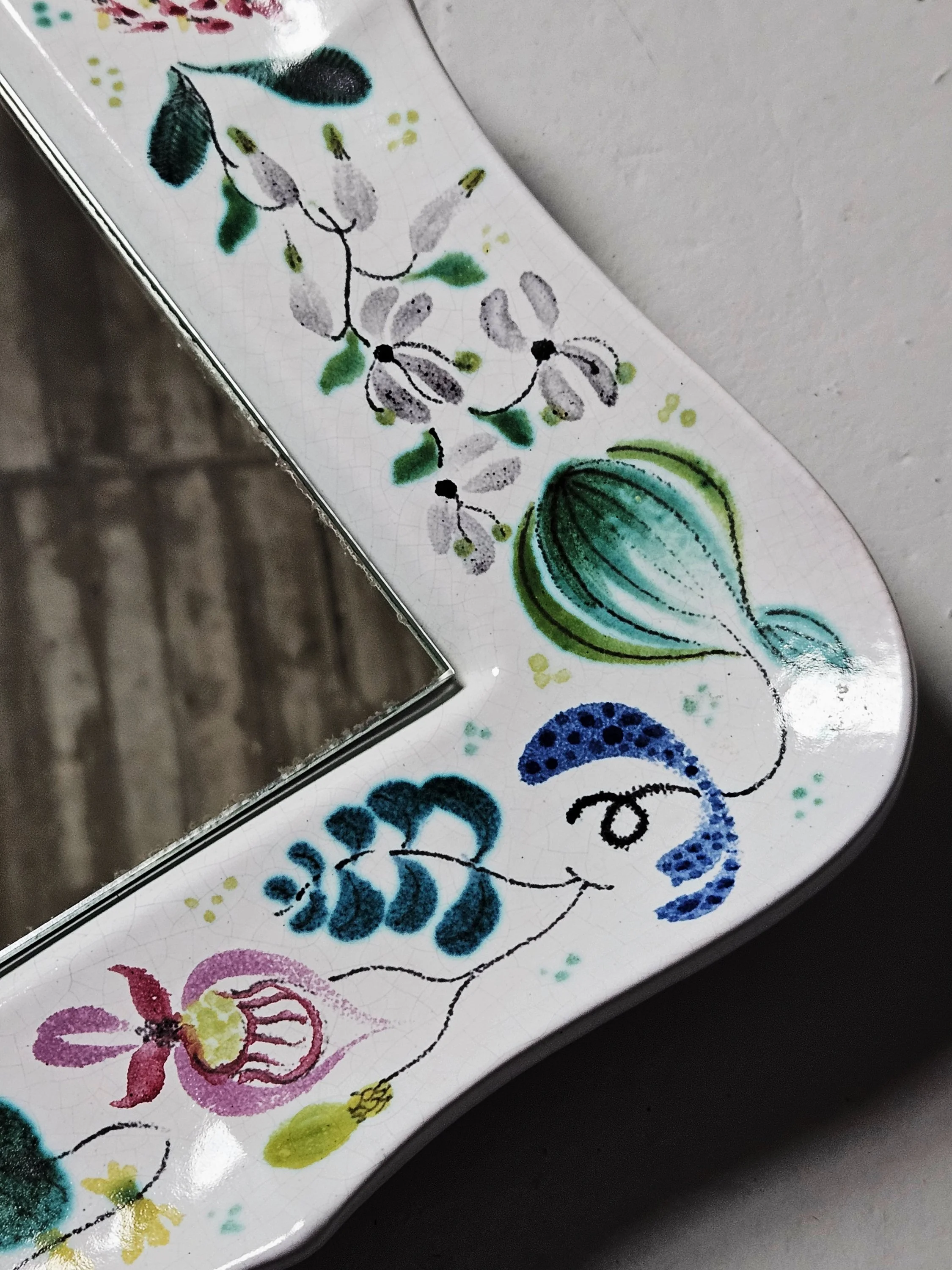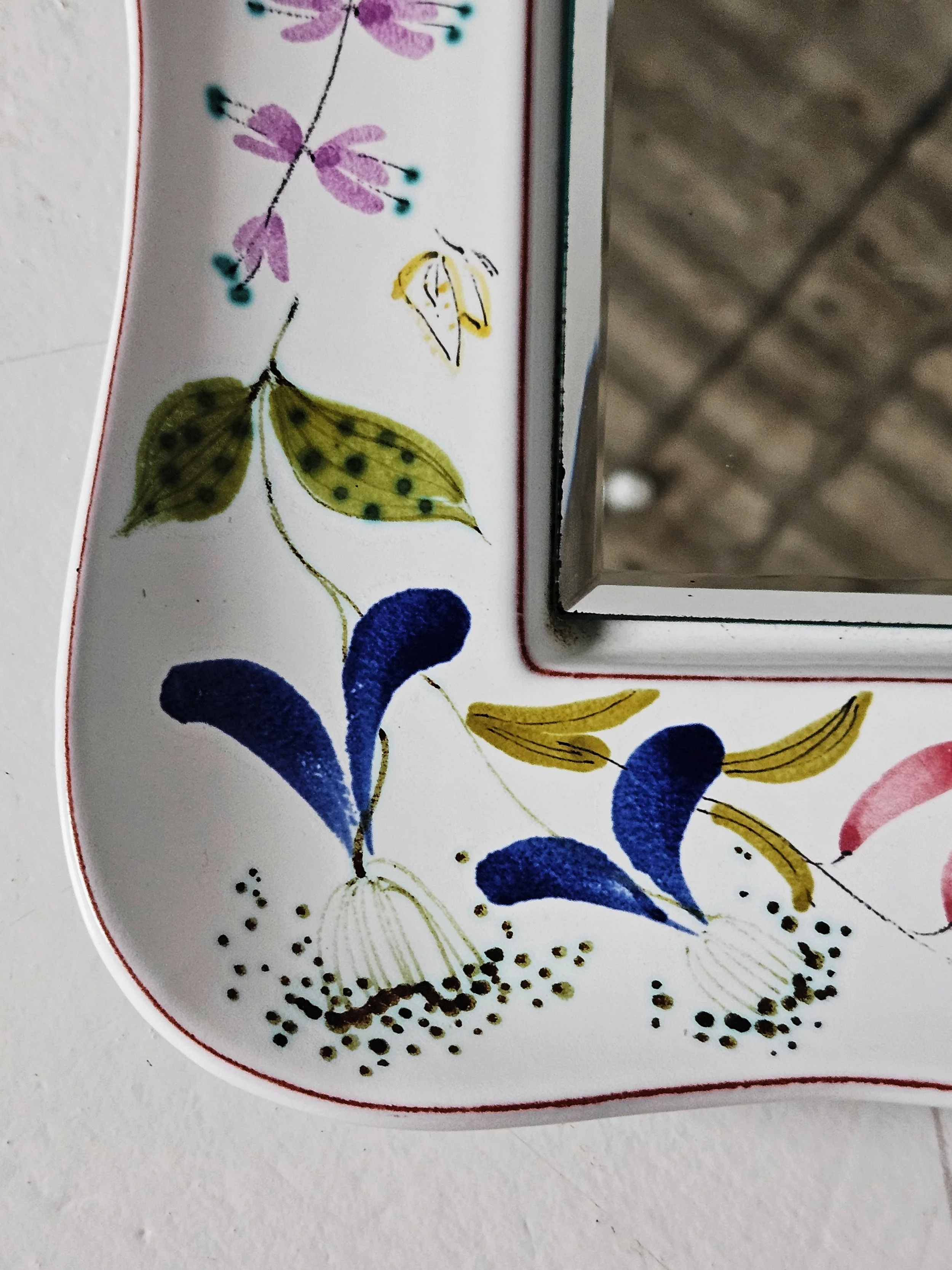 Lovely faience wall mirrors designed by Stig Lindberg. Everyone of the mirrors has a different floral painting on them. It is possible to hang the mirror horizontally as well as vertically