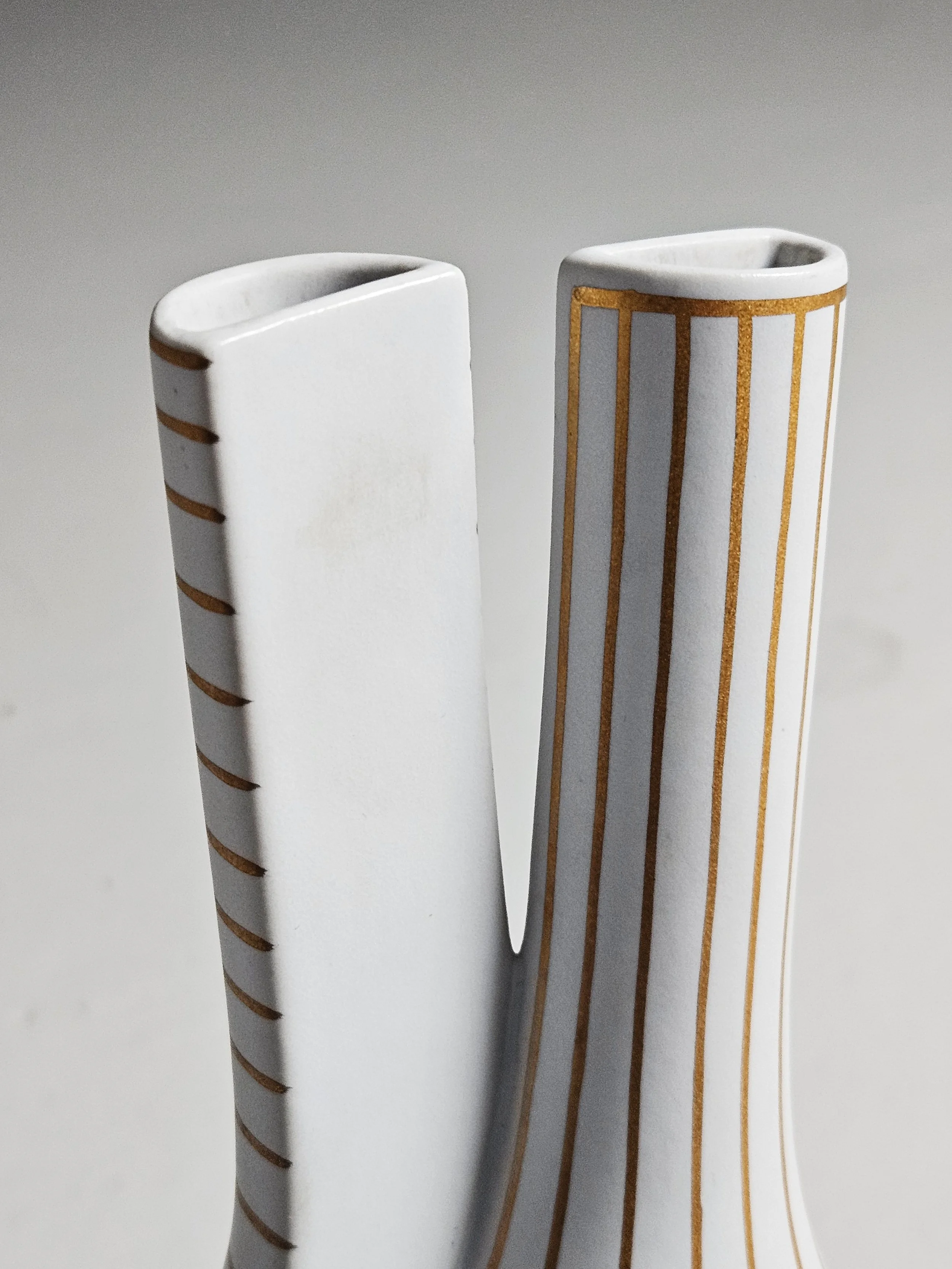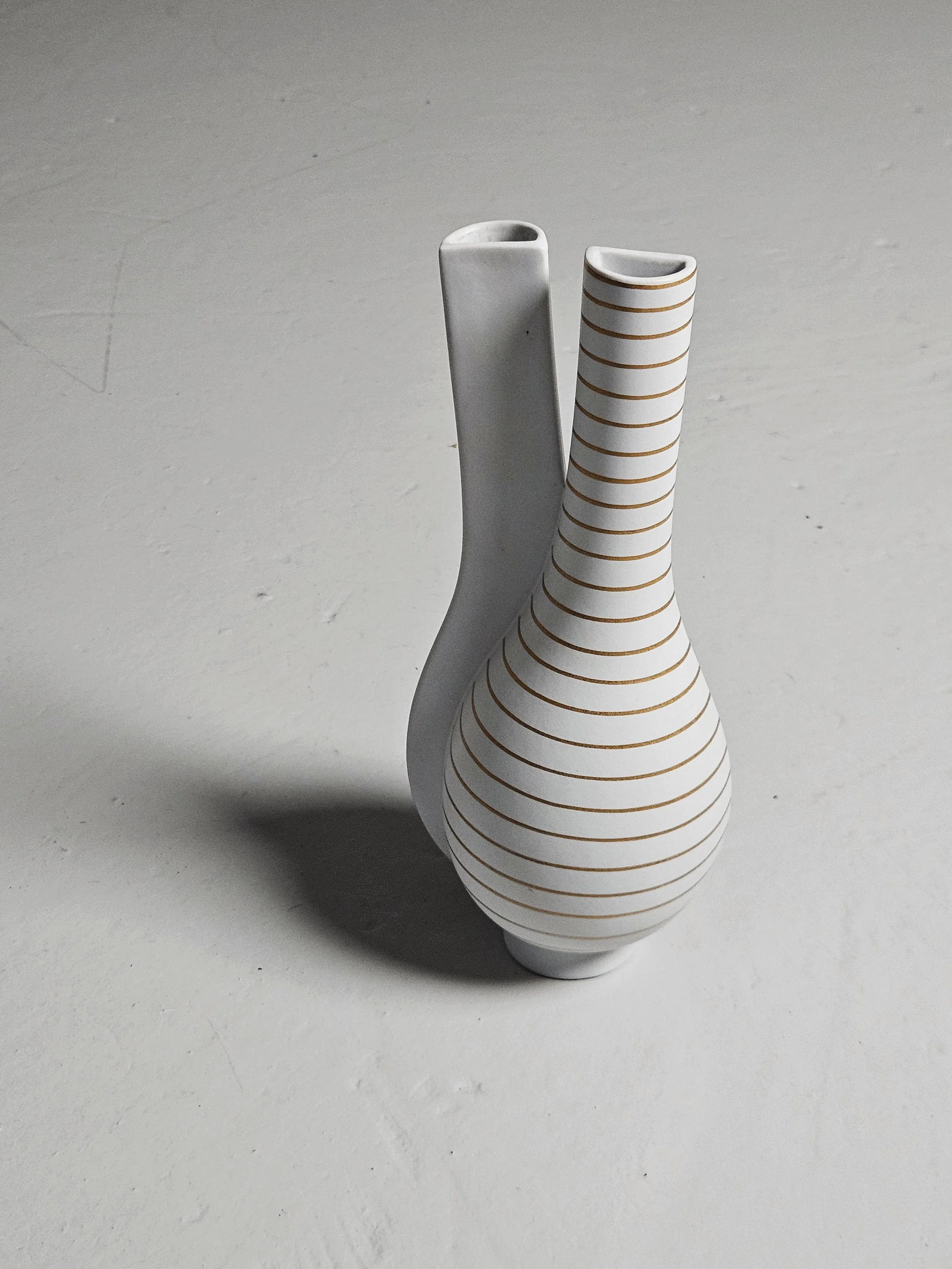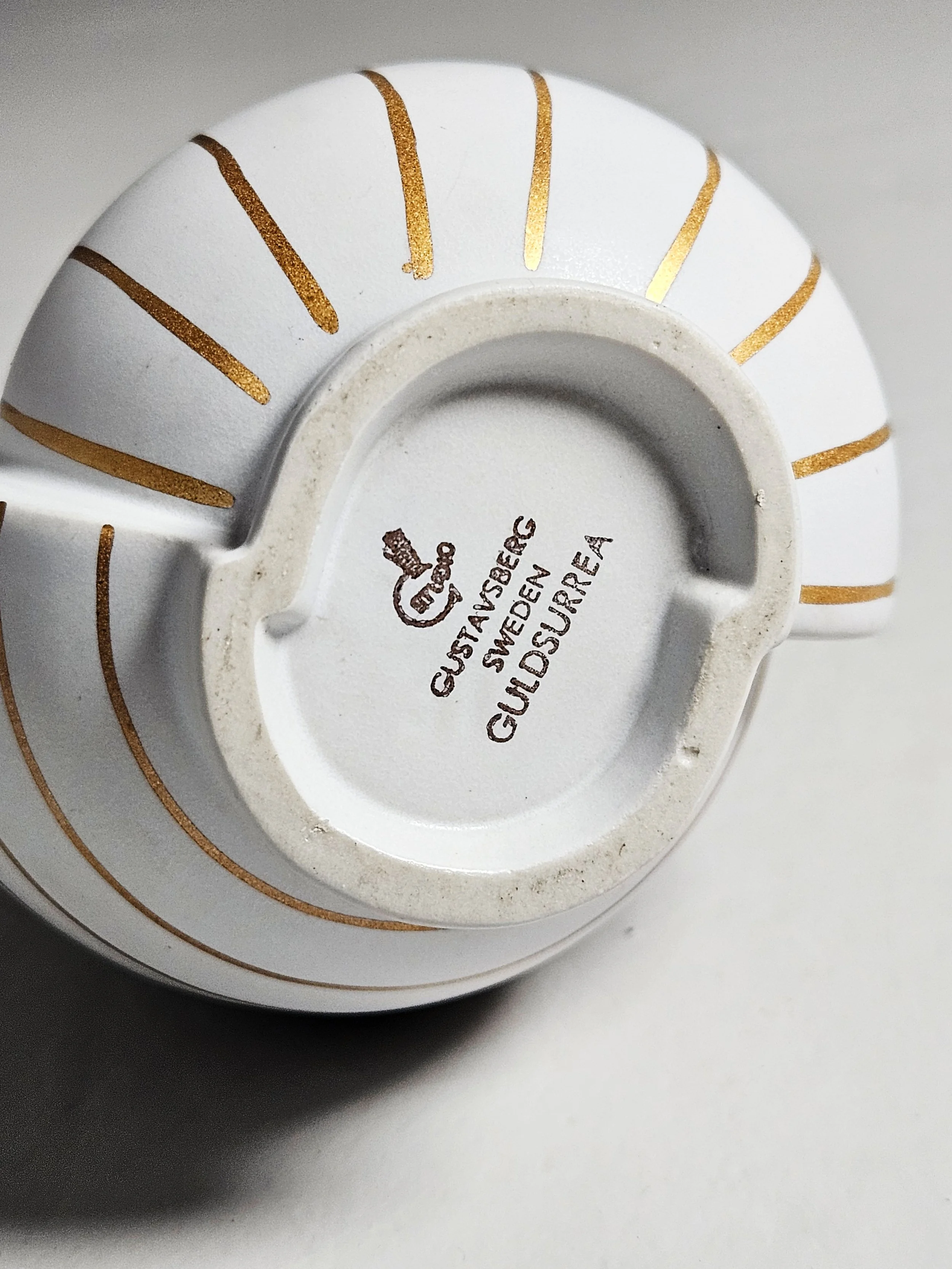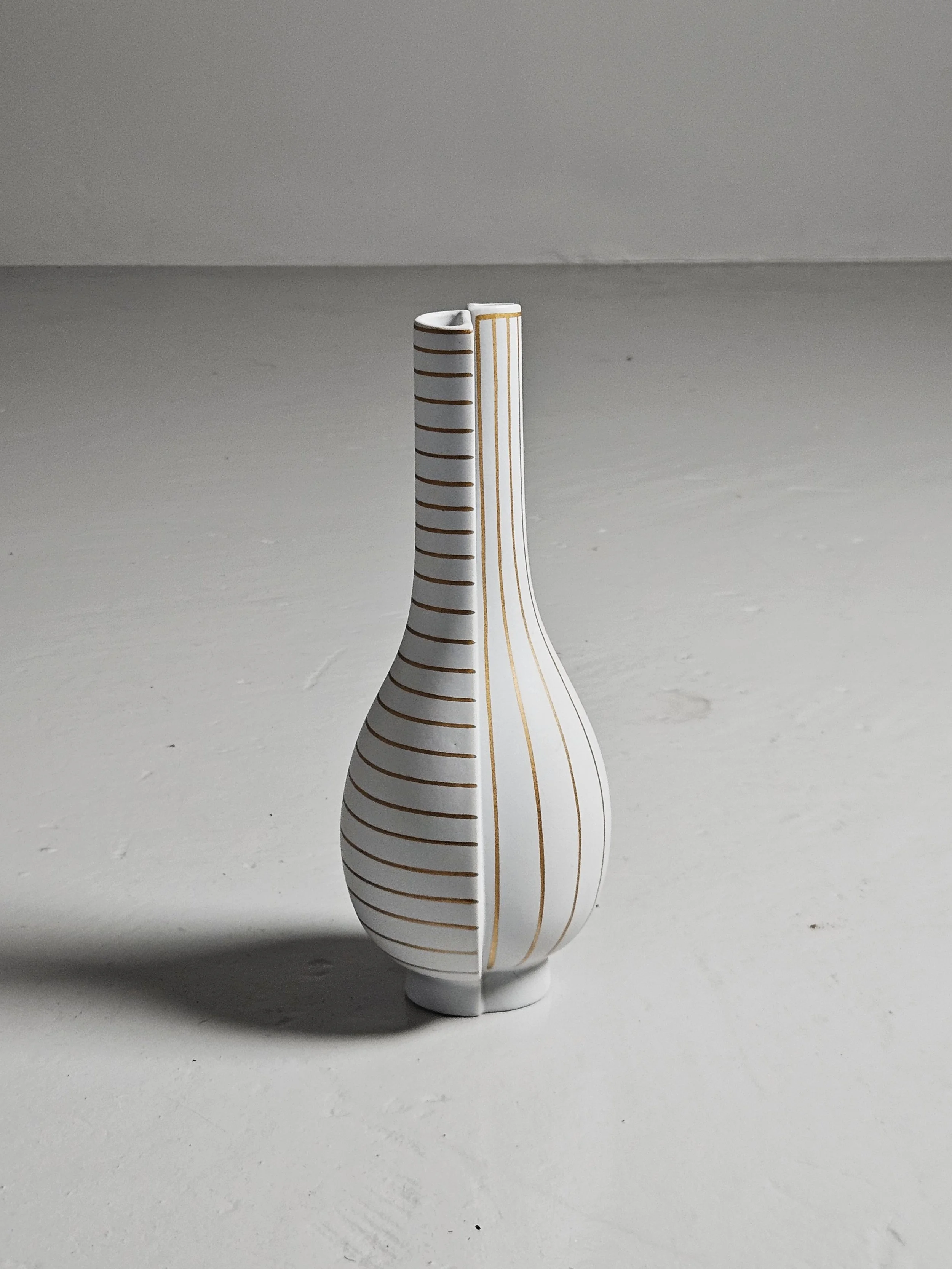 Vase 'Gold Surrea' designed by Wilhelm Kåge for Gustavsberg, Sweden, produced during the 1930s or 1940s. White carrara glaze with golden vertical and horizontal stripes. Marked with 'Studiohanden'. Glue residue from a sticker.