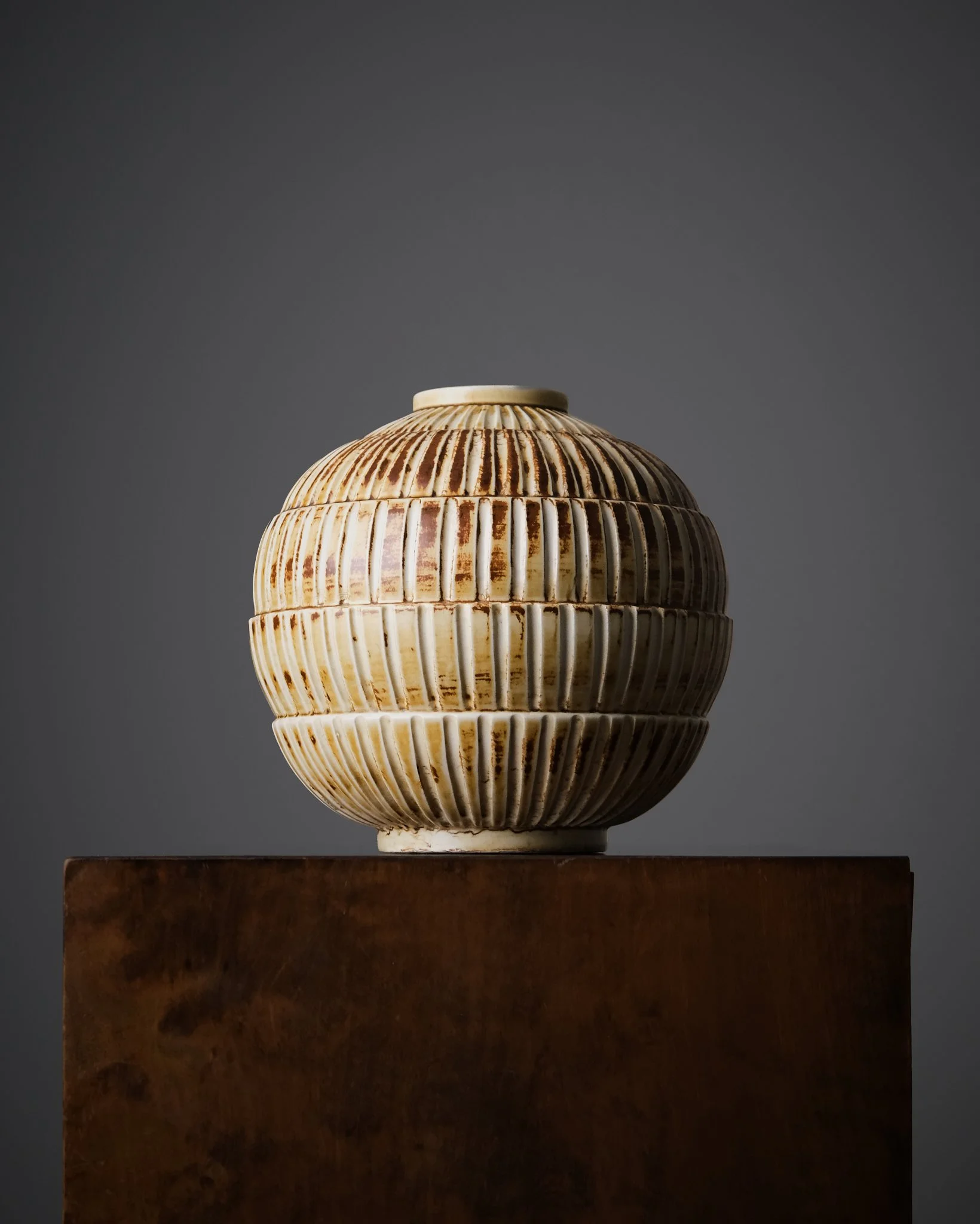 Decorative and uncommon stoneware vase designed by Gertrud Lönegren for Rörstrand in the late 1930s. Generously sized, with a warm brown and off-white glaze and a richly textured ribbed surface that emphasizes its sculptural, spherical form.